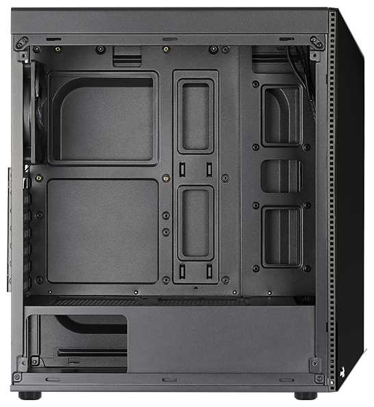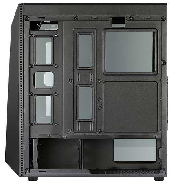- Возможность установки до 7 вентиляторов 120 мм (3 спереди, 2 сверху, 2 снизу) обеспечивает гибкость в организации воздушного потока.