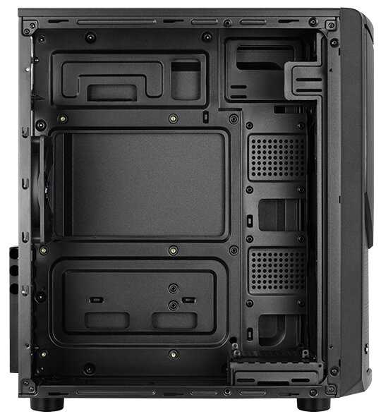 - Поддержка пяти 120-мм вентиляторов (1 комплектный на выдув) с перфорированными зонами на передней панели и боковой стенке.