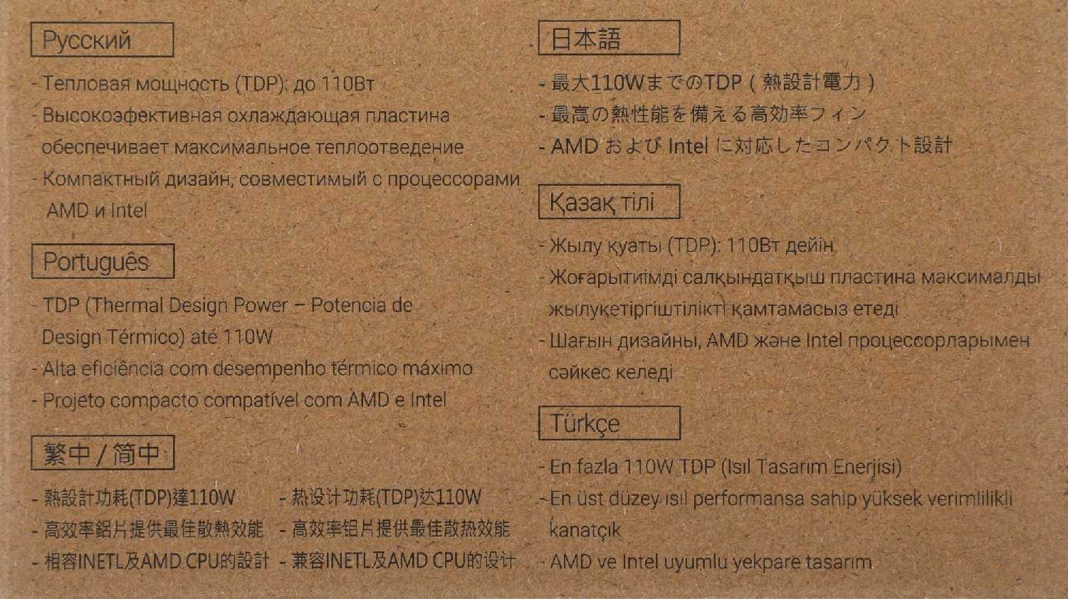 Заявленным 110 ваттам не соответствует, AMD Ryzen 5 5600G с TDP 65вт при малейшей нагрузке температура 70+,стресс тесты не делал ,боязно как то с таким охладом,пятак кулера не закрывает полностью камень,отсюда и охлад плохой, ну и еще он довольно шумный когда на высоких оборотах работает