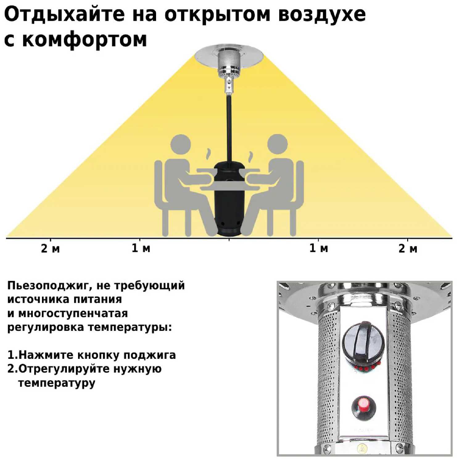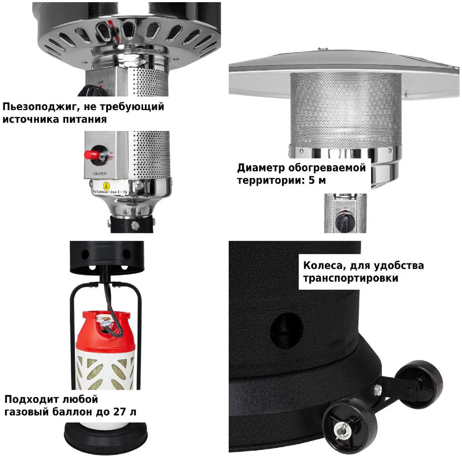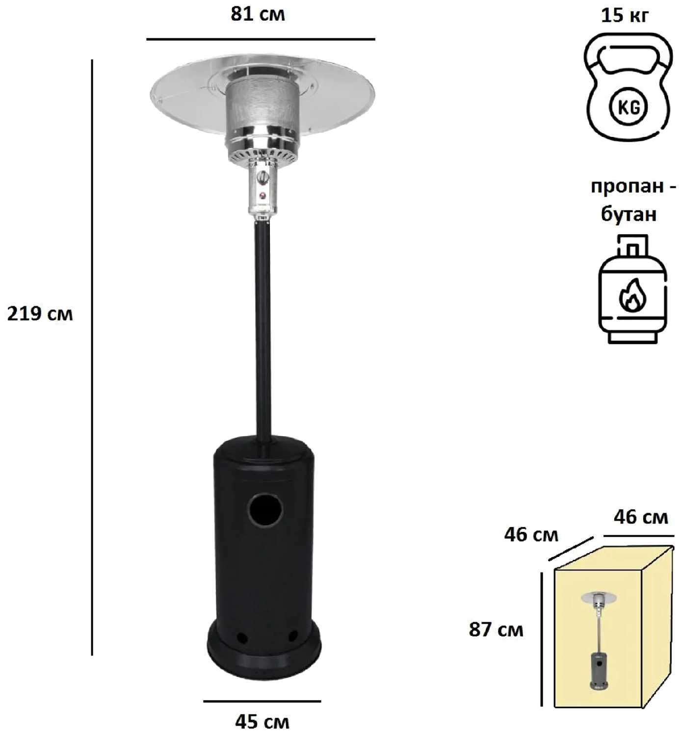 | Дополнительная информация : | время непрерывной работы 30 ч, пропан/бутан, механическое, 0.87 кг/ч, 5 кВт |