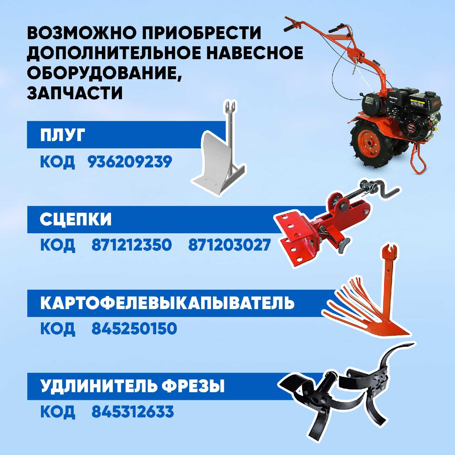 - Отсутствие цепи устраняет риск вытяжки или разрыва, повышая надежность при сезонном использовании для вспашки и покоса.
