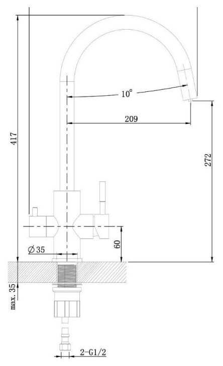 Очень высокий и красивый смеситель с возможностью подачи фильтрованной воды. Пользуемся таким уже более полугода, очень им довольны. Благодаря высокому изливу в раковину без проблем помещается большая кастрюля. Имеются две ручки для подачи воды. Большая отвечает за водопроводную воду, маленькая - за фильтрованную. Регулируется вода неплохо, мягко, без усилий. Подача фильтрованной воды происходит с того же выхода, только имеет отдельный канал внутри излива. Поверхность смесителя хромированной обработки, металл блестит и долго сохраняет свой внешний вид.
