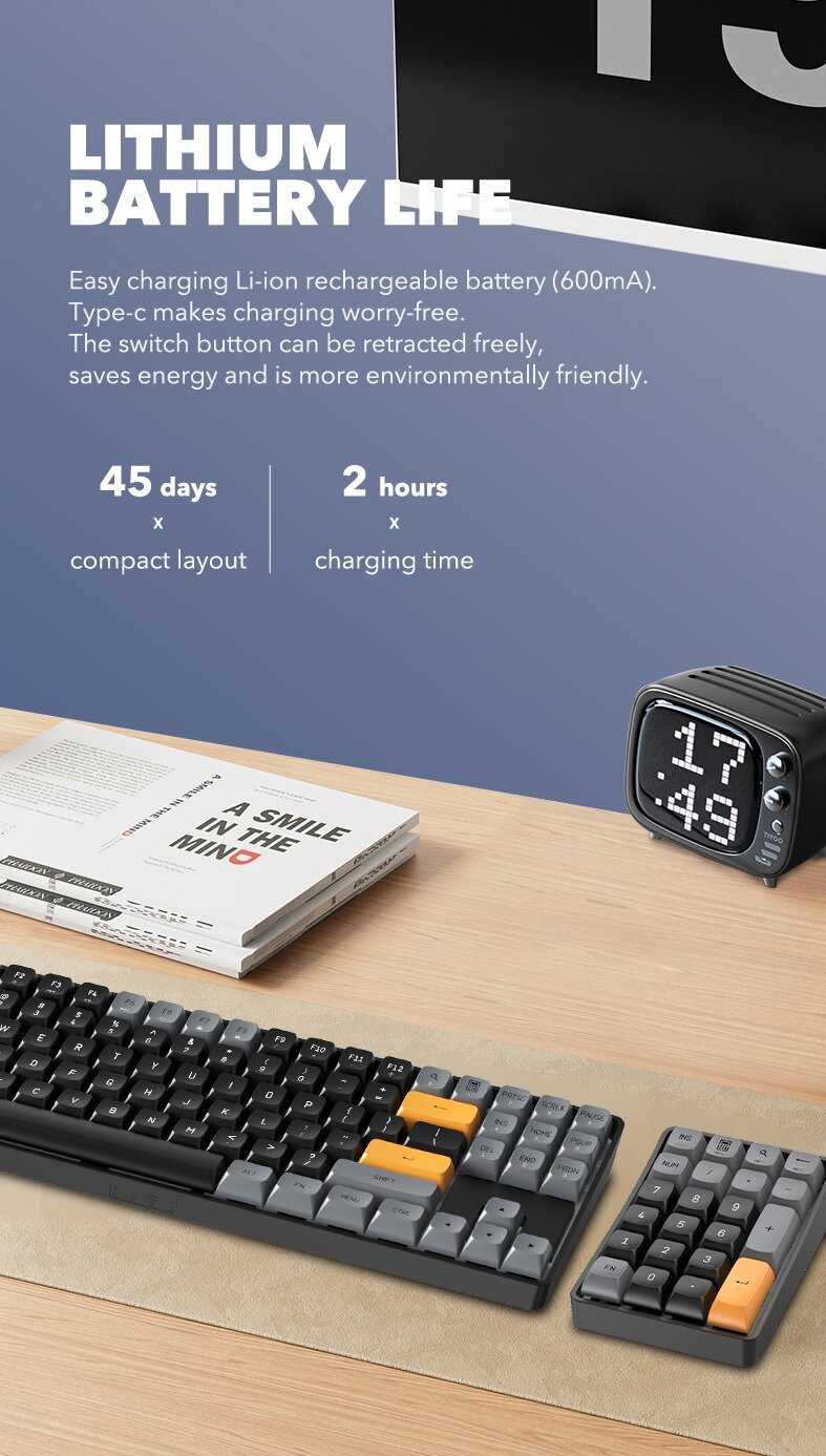 Батарея работает очень долго — многие пользователи заряжают его 1–2 раза за полгода ежедневного использования или не заряжают месяцами. После первой зарядки нумпад функционирует несколько месяцев без подзарядки, даже при активном применении в работе. Некоторые отмечают, что он "может работать вечно", если использовать не постоянно. Однако точный процент заряда индикатором не показывается, что усложняет контроль. -