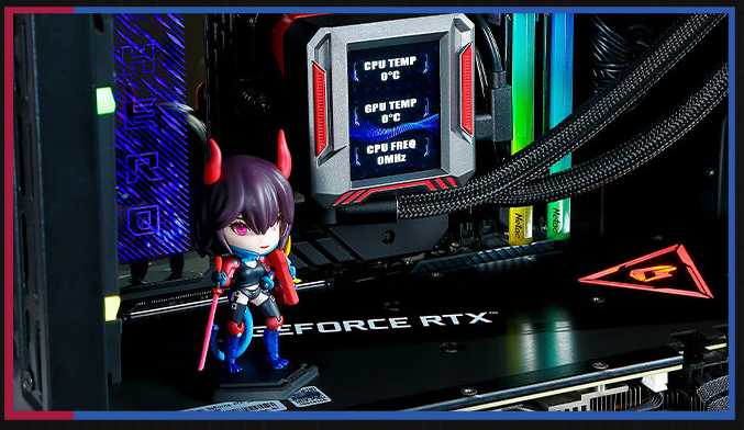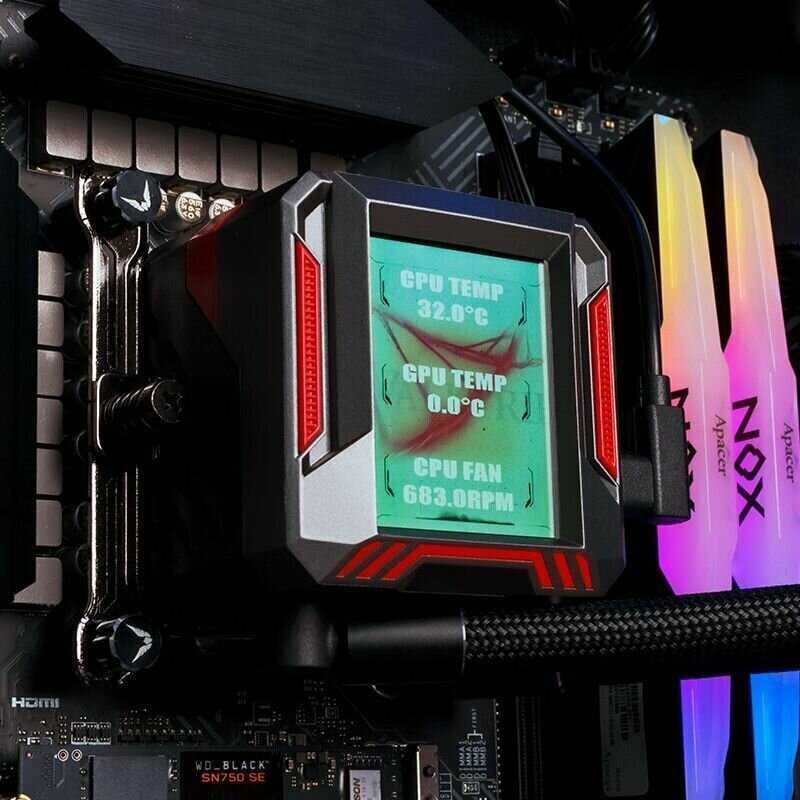 - Экран на помпе с высокой частотой обновления позволяет загружать видео и GIF через софт, создавая эффектный вид в корпусе.