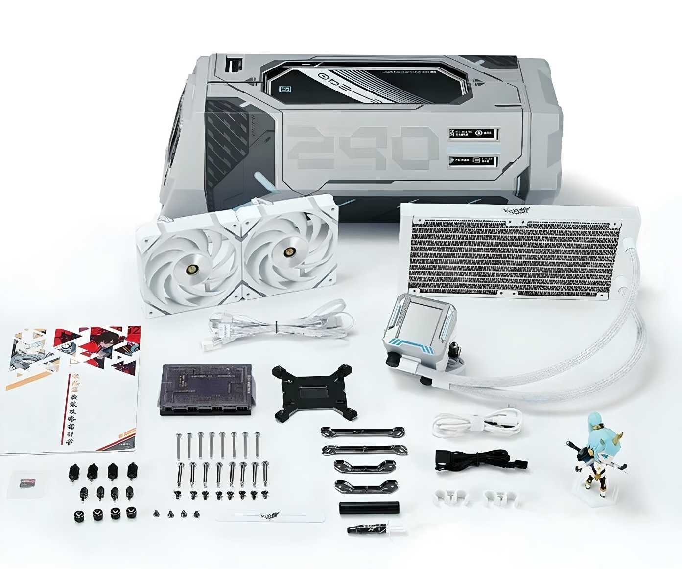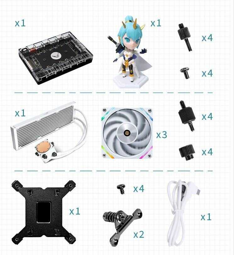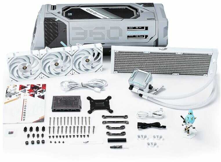 Классный радиатор с двумя хорошими вентиляторами, они подозрительно напоминают вентиляторы Lian Li. В комплекте есть сменные декоративные панели на радиатор. Конвертик с какими-то карточками, все хорошо упаковано в двух больших коробках. Я не знают по какой тематике внешний вид этого устройства и карточки в комплекте, то-ли по какой-то игре или аниме или китайским комиксам, но внешне все прикольно. Поставил радиатор на на 5600x, в нагрузке температура чуть выше 60.