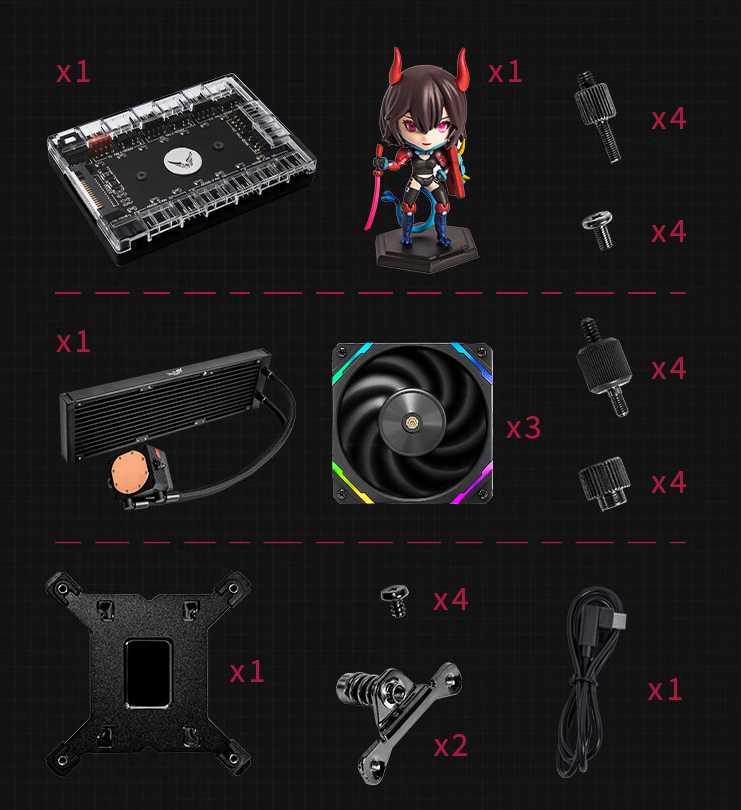 - Включает хаб для вентиляторов и ARGB, сменные насадки на помпу (с экраном и простой ARGB), термопасту в шприце и на подошве.