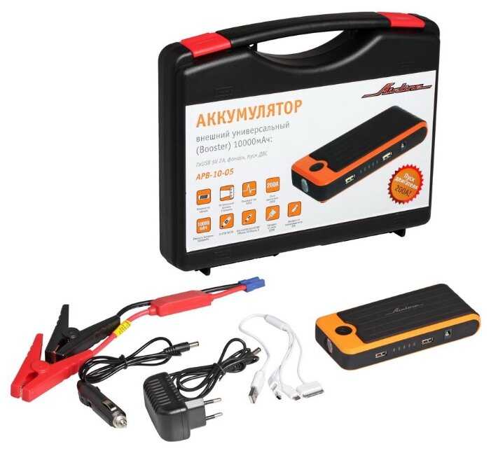 | Подробная комплектация : | Аккумулятор внешний - 1шт. Силовые провода с зажимами "крокодил" для пуска ДВС - 1шт. Кабель USB - microUSB/miniUSB/IPhone/TypeC - 1шт. Адаптер для зарядки от прикуривателя - 1шт. Адаптер для зарядки от сети 220В - 1шт. Инструкция - 1шт. Пластиковый кейс - 1шт. |