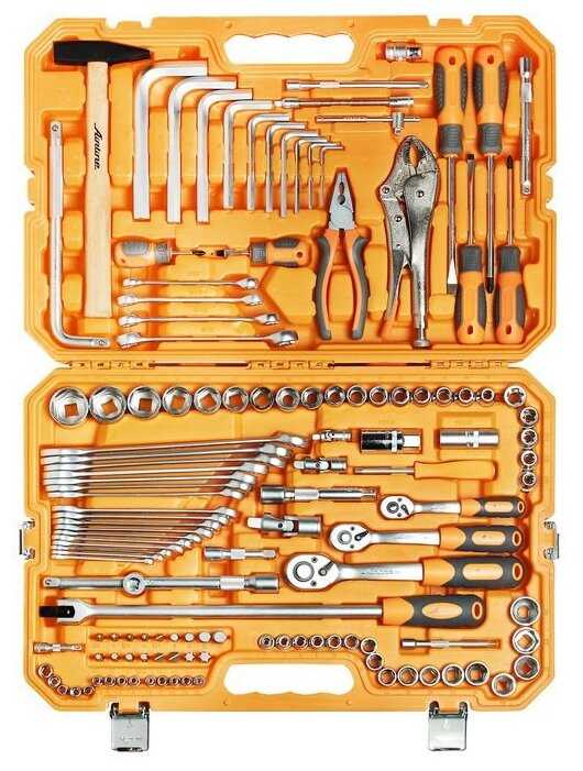 | Инструменты в комплекте : | бокорезы, вороток для головок, зубила, клещи, клещи переставные, ключ переставной гаечный, ключ разводной, ключи гаечные, ключи имбусовые (шестигранные), молоток, отвёртки, пассатижи, плоскогубцы, трещотка, трубчатые ключи |