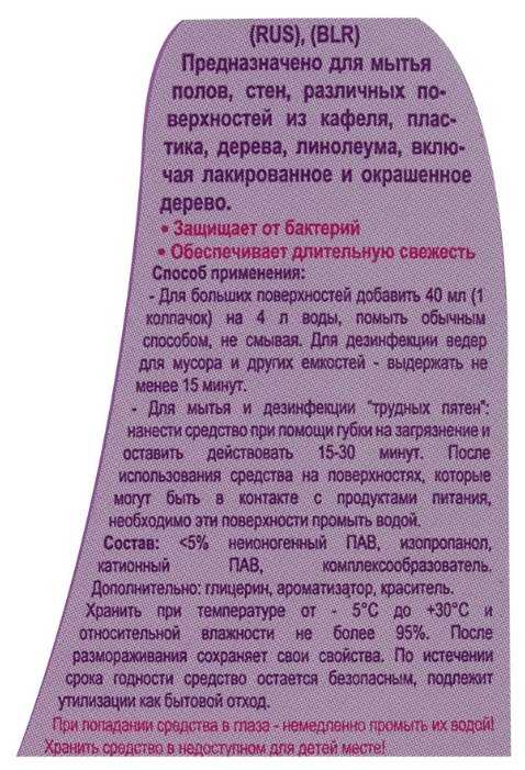 Способ применения : | для больших поверхностей добавить 40 мл (1 колпачок) на 4 л воды, помыть обычным способом, не смывая. для дезинфекции ведер для мусора и других емкостей - выдержать не менее 15 минут. для мытья и дезинфекции "трудных пятен" нанести средство при помощи губки на загрязнение и оставить действовать 15-30 минут. после использования средства на поверхностях, которые могут быть в контакте с продуктами питания, необходимо эти поверхности промыть водой |