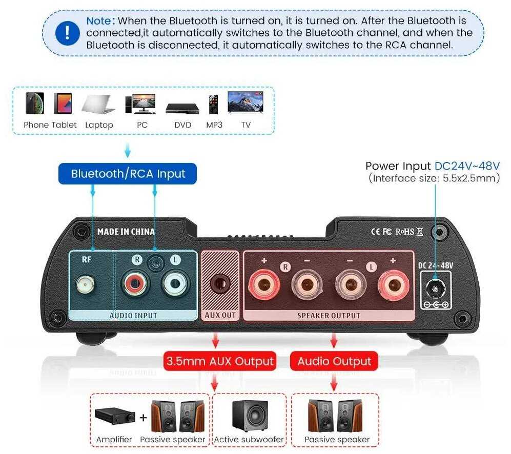 - + Отличный усилитель! Подключение через Bluetooth мгновенное. Звук шикарный! Низы ,средние и высокие звучат одновременно не "забивая" друг друга. Басс глубокий, объёмный. Появились новые нотки/оттенки звука, по сравнению со штатным усилителем, который был в комплекте с колонками, ввиде блочного музыкального центра. Эту аккустику, 60 Вт 8 Ом, прокачивает на всё 100%. Причём, звук усилителя ставлю на 40%(меньше половины), этого достаточно для максимальной громкости, иначе колонки, наверно, "порвёт". Много избыточной мощности остаётся в запасе. Итог, данный усилитель справляется лучше со своей задачей, чем штатный.