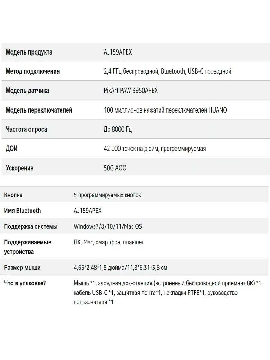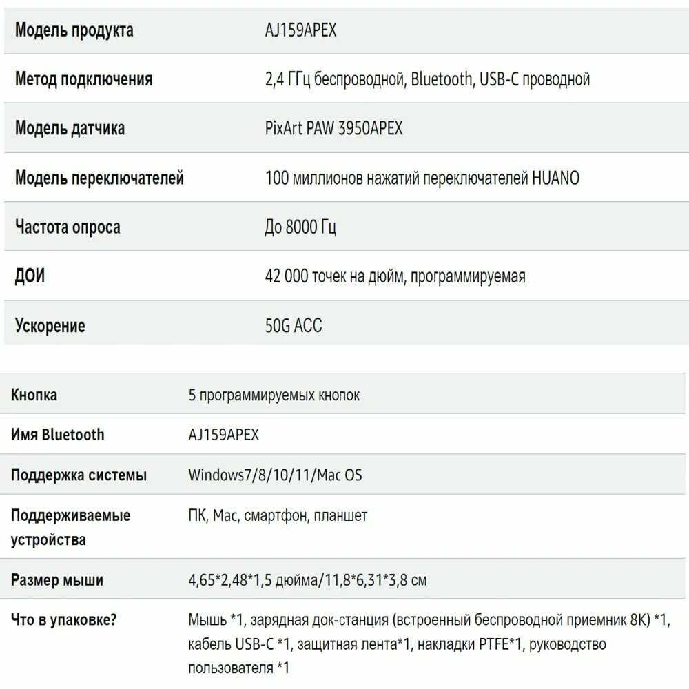 При цене 5000-6000₽ AJ199 предлагает топовый сенсор PAW3950 и частоту опроса до 8000 Гц, недоступные в этом сегменте (аналоги вроде Razer Viper Mini или Glorious Model O- стоят дороже при худших характеристиках). Идеальна для киберспортсменов-любителей, ценящих минимальный вес (63 г) и высокий DPI для низкой чувствительности в шутерах. На фоне флагманов (Razer Viper V3 Pro за 13000₽) проигрывает в качестве материалов и времени автономной работы, но выигрывает по соотношению цена/производительность. Ключевое предостережение – док-станция: её покупка оправдана только при готовности к потенциальному ремонту. Для мобильного использования с ноутбуком лучше выбрать модели с компактным USB-приёмником.