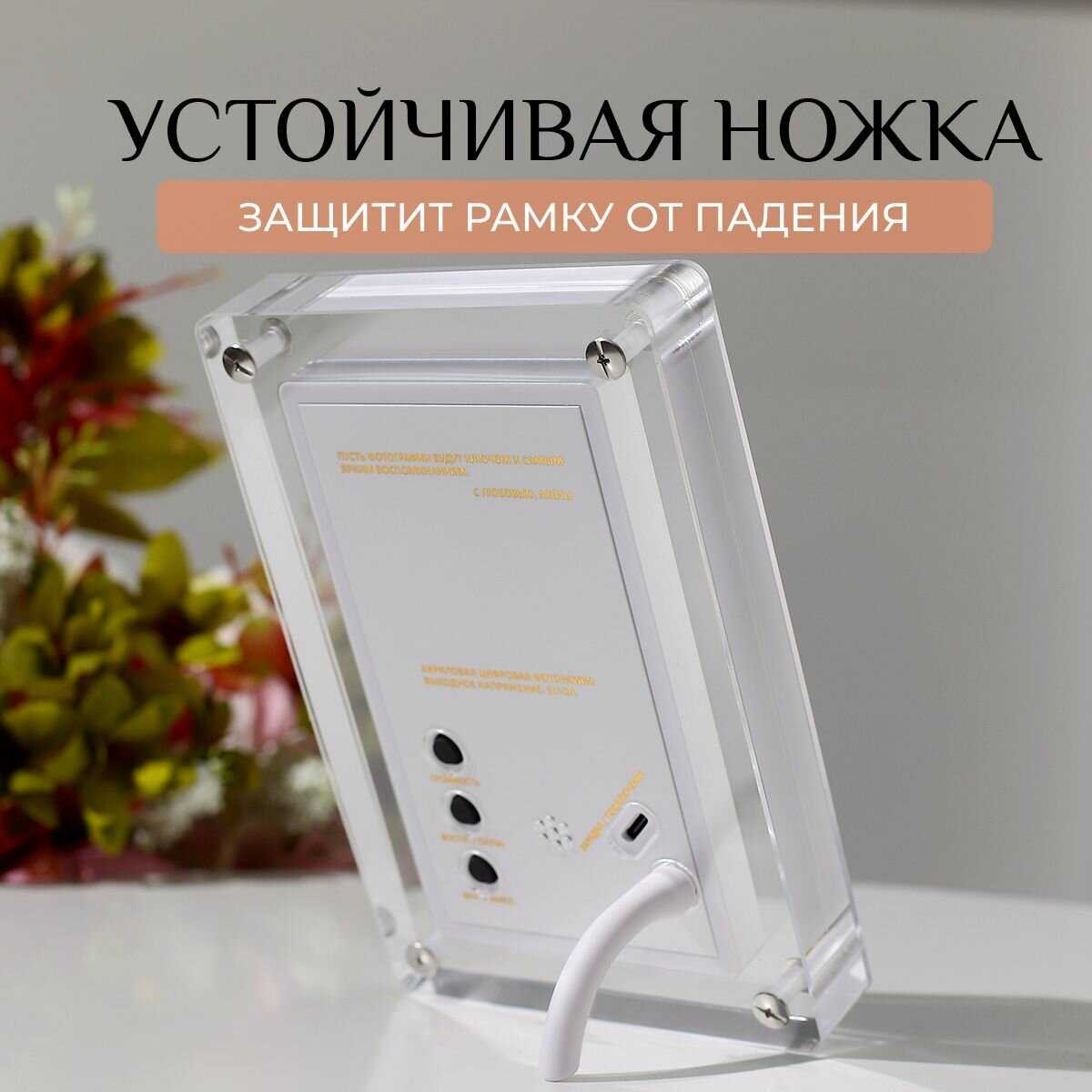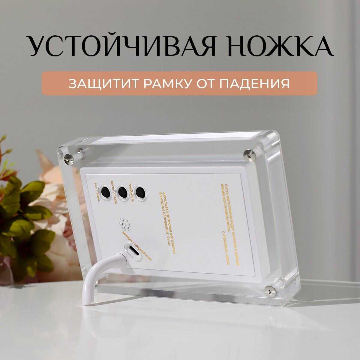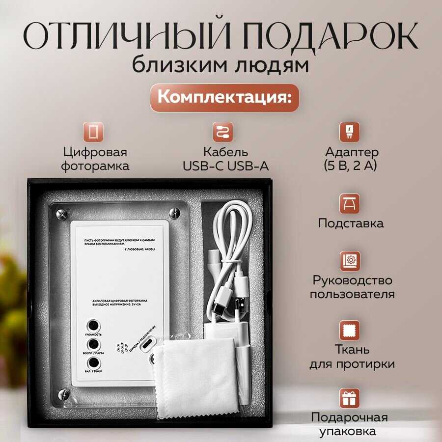 Безумно классная рамка, были приятно удивлены. Подарочная упаковка очень милая, в комплекте был набор из открытки, конвертика и наклейки — за это отдельное спасибо. Также к ней прилагаются кабель, блок, салфеточка для протирания экрана и подставка. Качество фото и звука хорошее, инструкция понятная на русском языке — мы брали в подарок для бабушки, и это стало весомым преимуществом