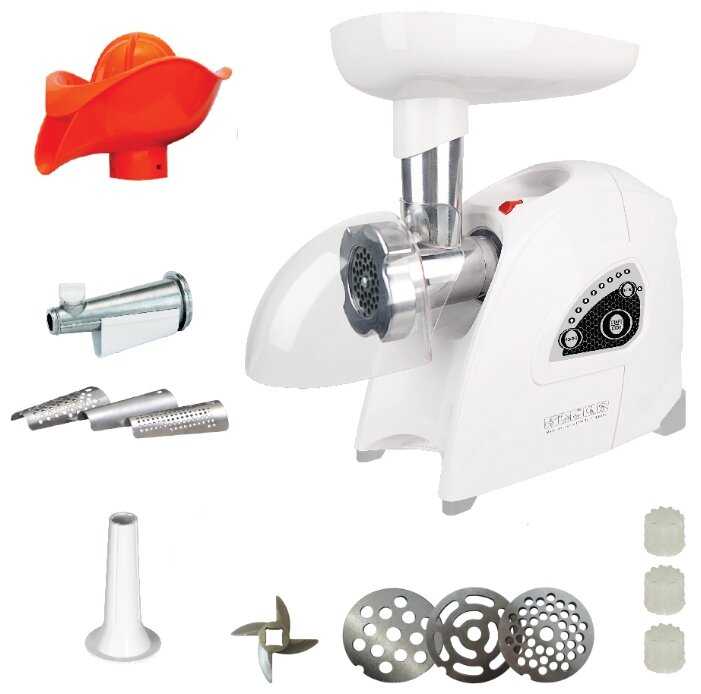 Мясорубка была куплена маме в подарок. Очень классная, шустро перемалывает фарш. По комплектации вообще шик. Есть соковыжималка для томатов, накладка, которая оберегает столешницу от брызг, есть пресс для цитрусовых, насадка для сосисок и три перфорированных диска. Мясорубка мощная, жужжит, но делает свое дело на твердую пятерку. Не ерзает по столу. Очень хорошая модель.
