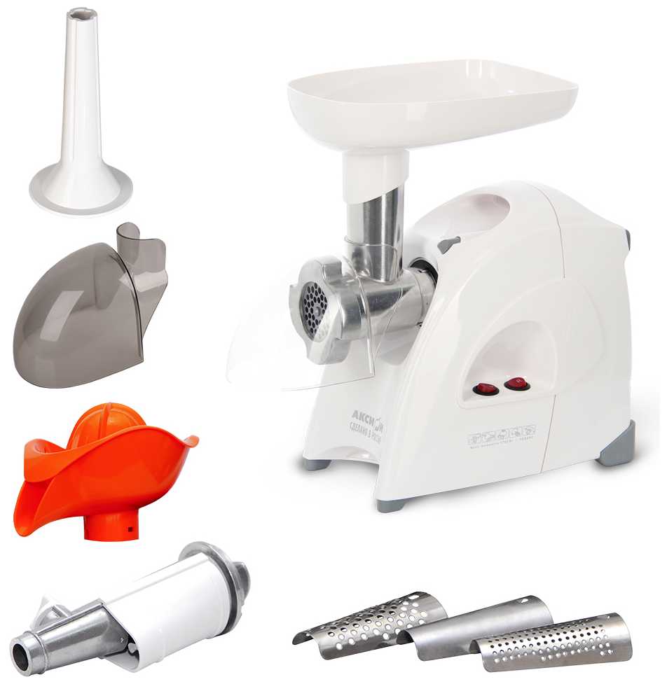 - Включает 3-5 решеток для разного помола фарша, насадку для колбас, соковыжималку для цитрусовых и овощерезку (в зависимости от модели М41.01-04, упоминается как преимущество над конкурентами с 2 насадками).