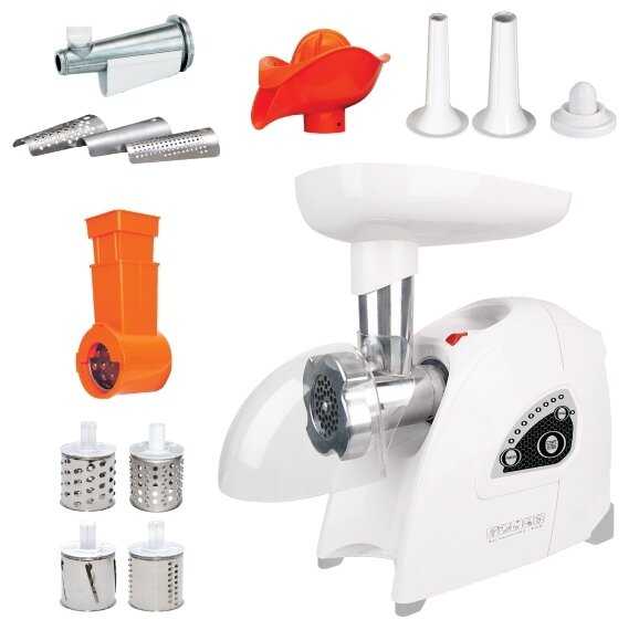 - Насадки для кеббе, колбас, корейской моркови, тёрки разных видов и соковыжималки (шнековая и для цитрусовых).