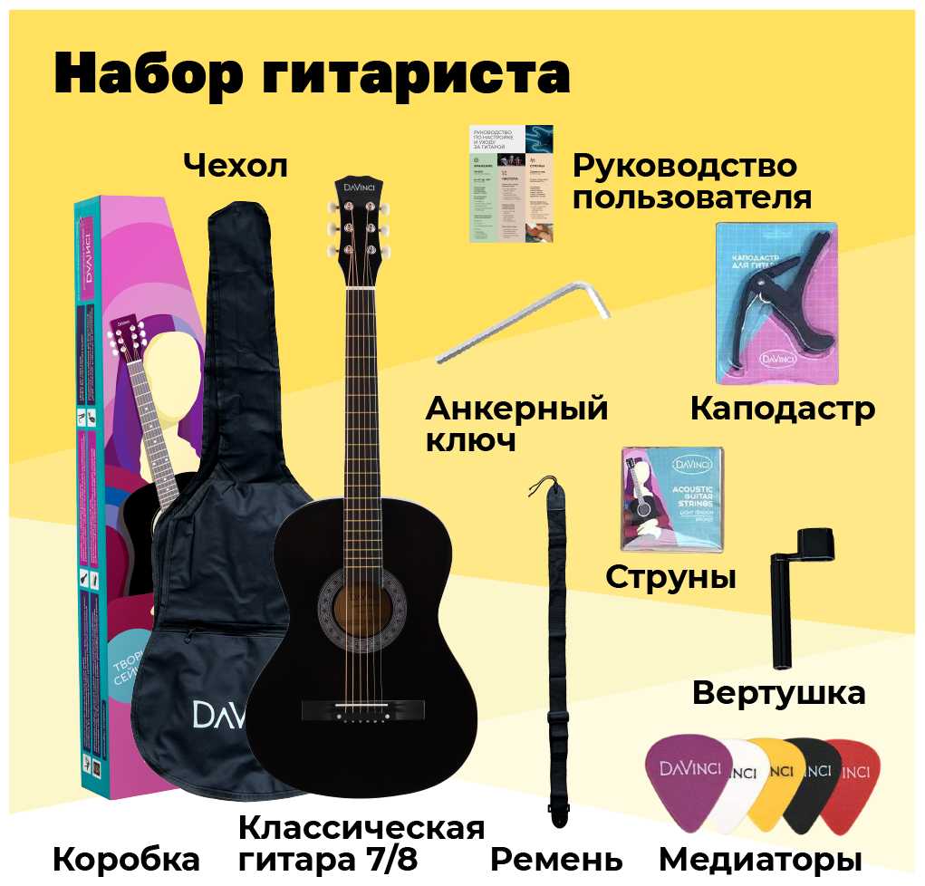 DaVinci DF-50A BK PACK - набор гитариста: акустика, чехол, медиатор, вертушка, ремень, каподастр, струны
