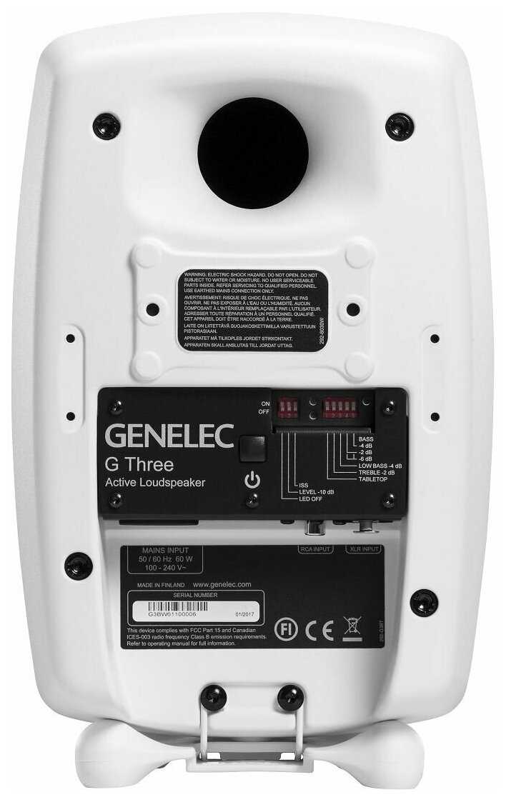 Genelec G Three BW активная 2-полосная АС. НЧ 5" 50Вт, ВЧ 0.75" 50Вт. Подставки. Входы: аналог. RCA, XLR. Макс. SPL 104 дБ, 47Гц-25кГц (-6 дБ). Кроссо