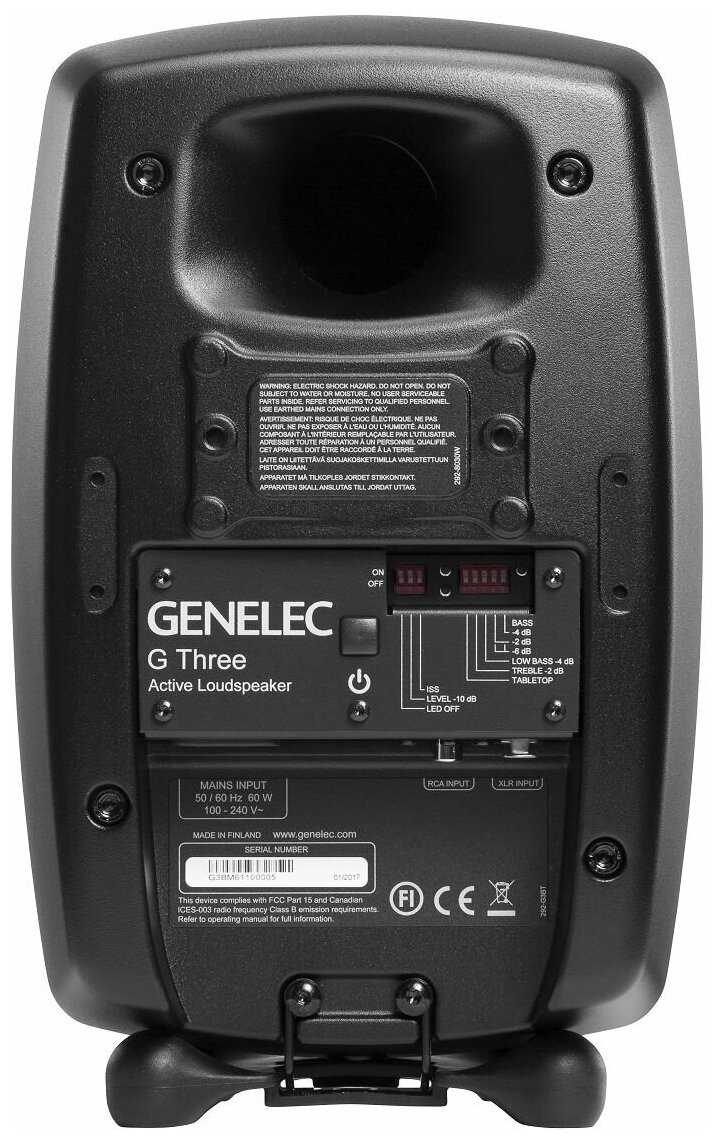 Genelec G Three BM активная 2-полосная АС. НЧ 5" 50Вт, ВЧ 0.75" 50Вт. Подставки. Входы: аналог. RCA, XLR. Макс. SPL 104 дБ, 47Гц-25кГц (-6 дБ). Кроссо