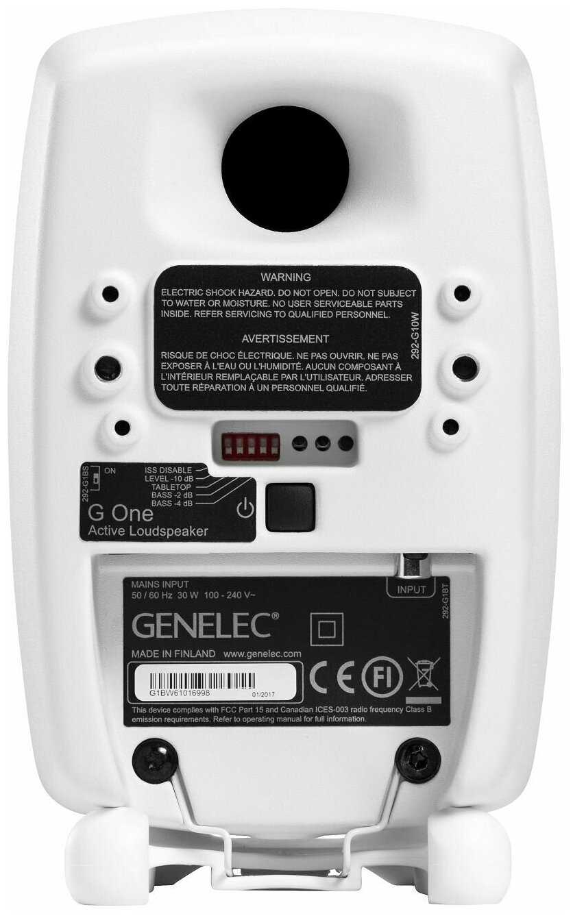Genelec G One BW активная 2-полосная АС. НЧ 3" 25Вт, ВЧ 0.75" 25Вт. Подставки. Вход: аналог. RCA. Макс. SPL 96 дБ, 67Гц-25кГц (-6 дБ). Кроссовер 3000Г