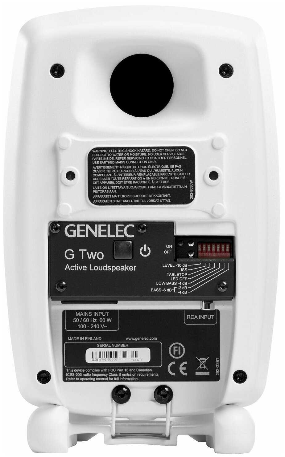 Genelec G Two BWM активная 2-полосная АС. НЧ 4" 50Вт, ВЧ 0.75" 50Вт. Подставки. Вход: аналог. RCA. Макс. SPL 100 дБ, 56Гц-25кГц (-6 дБ). Кроссовер 300
