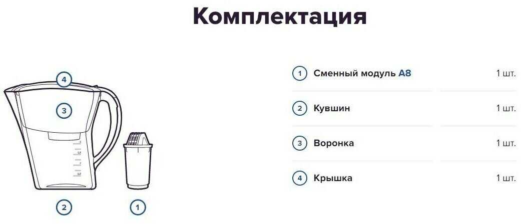 | Особенности : | календарь замены фильтрующего модуля, прозрачный корпус |