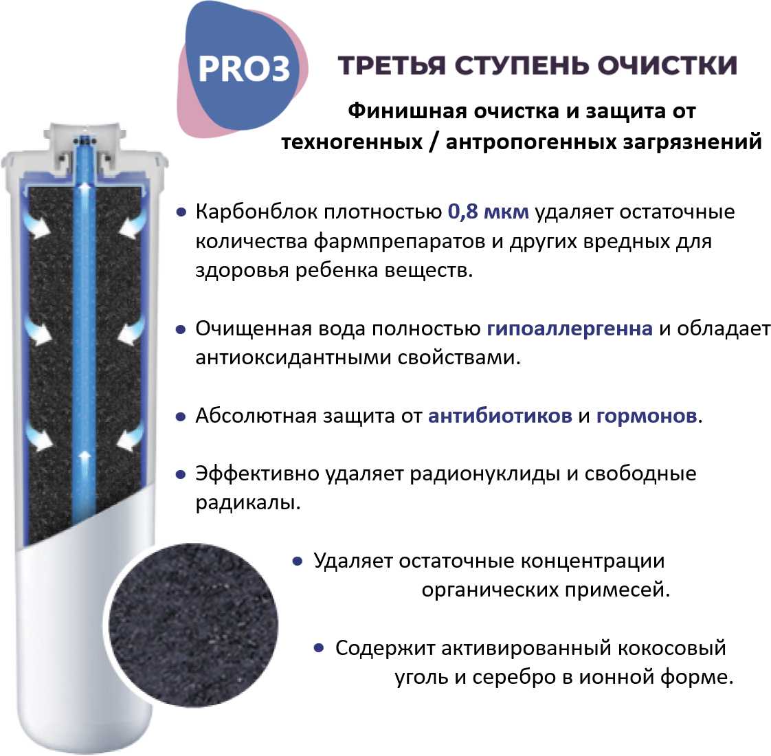 - Специализированный модуль удаляет остатки фармацевтических веществ из городской воды, снижая риски аллергии и проблем с пищеварением у детей.