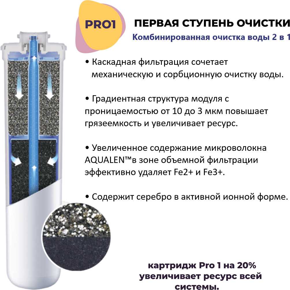 - Предотвращение мутности в первые минуты использования путём промывки позволяет быстро достичь прозрачности, повышая доверие к качеству очистки.