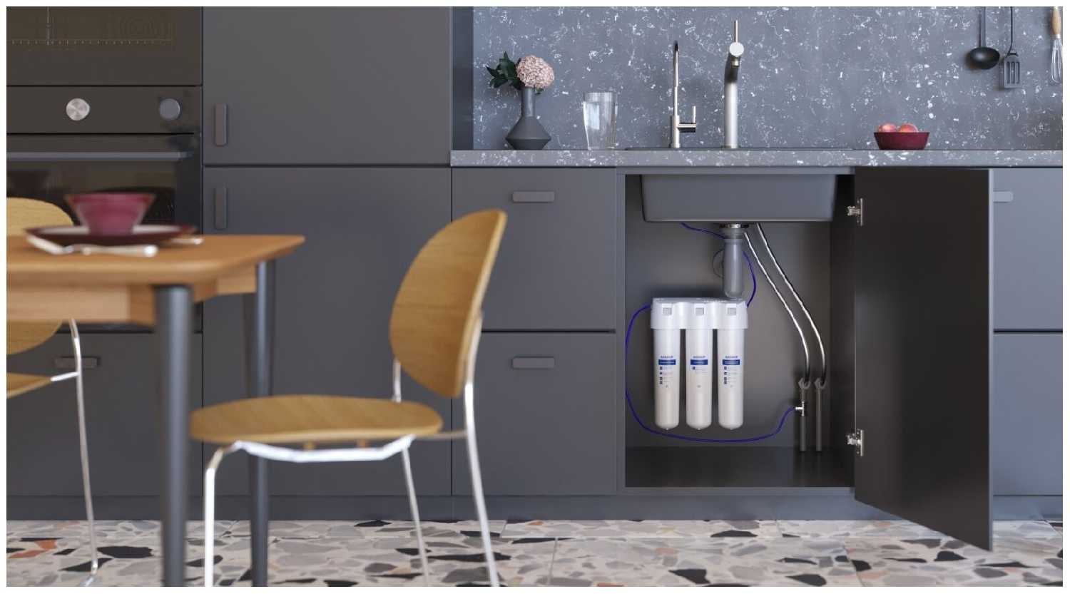 - Занимает минимум места под мойкой благодаря вертикальной компоновке и Slim-дизайну.