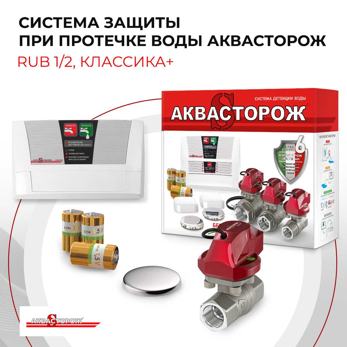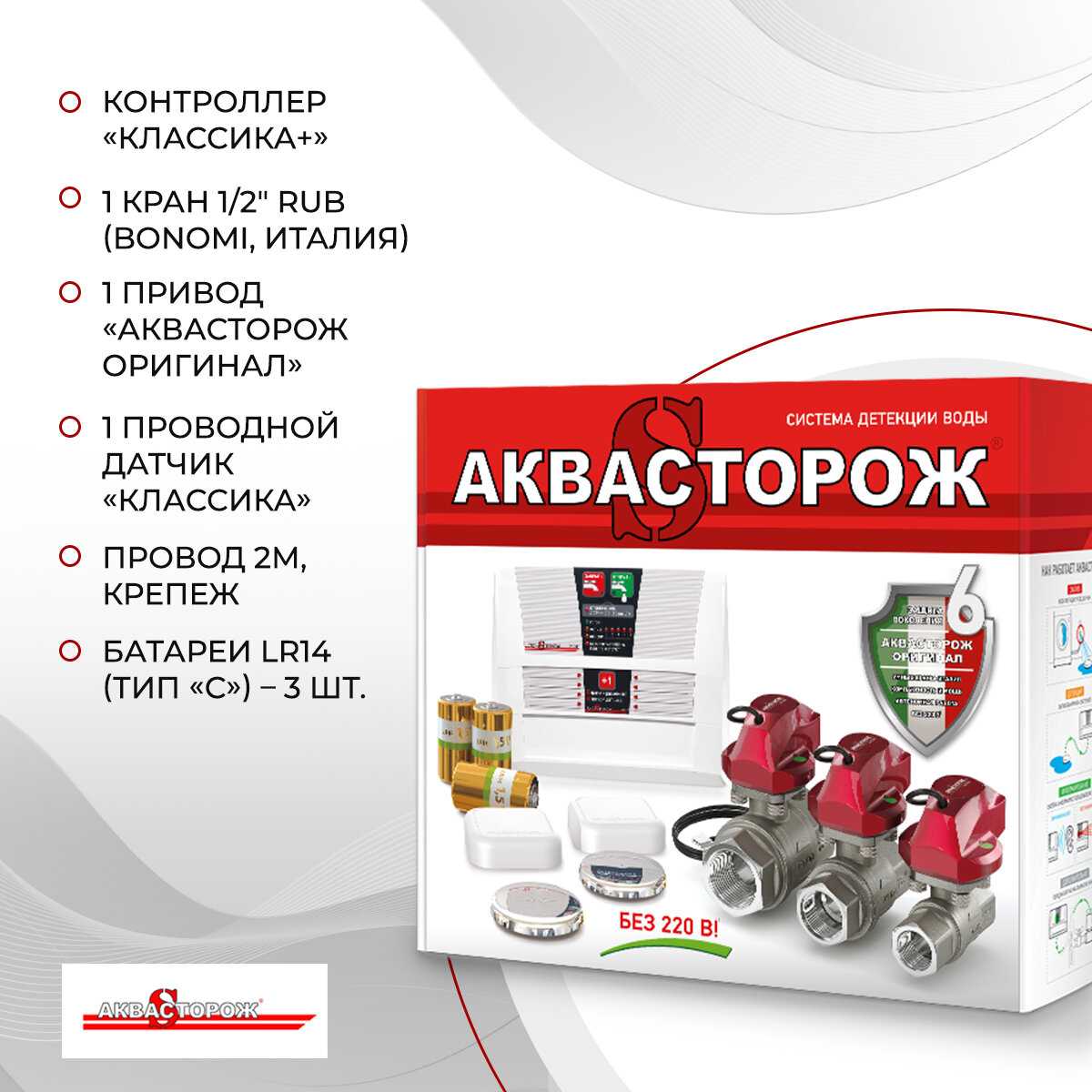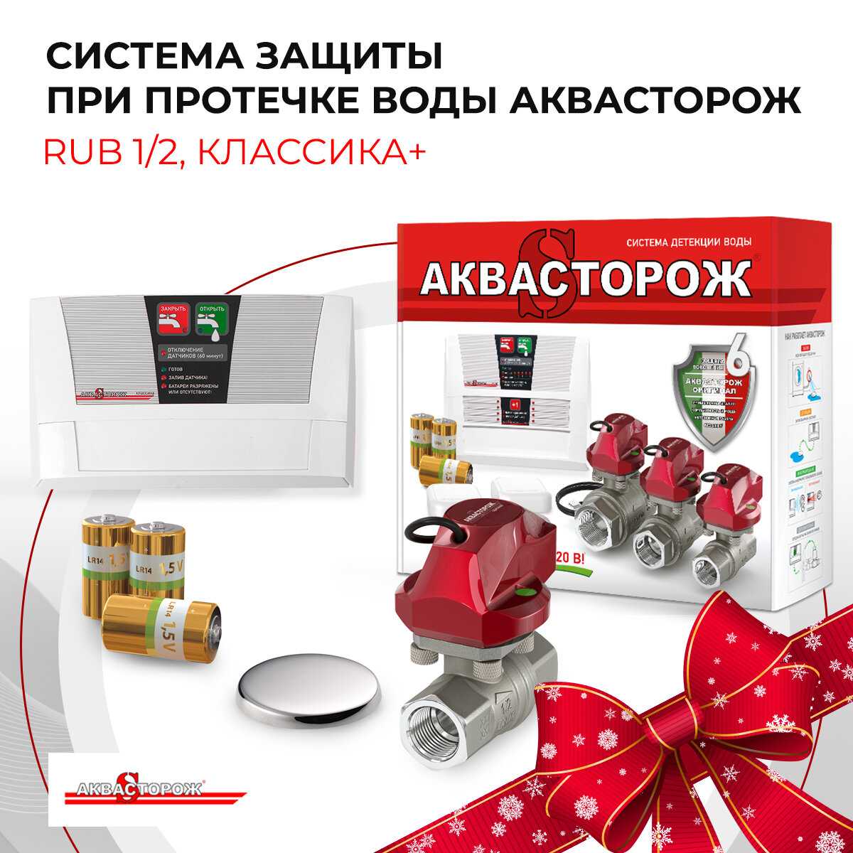 Подробная комплектация : | Контроллер Классика +, Кран 1/2"RuB с приводом "Аквасторож Оригинал" - 1 шт., Датчик проводной Классика - 1 шт., кабель проводного датчика - 2м, Батарея LR14 - 3 шт |