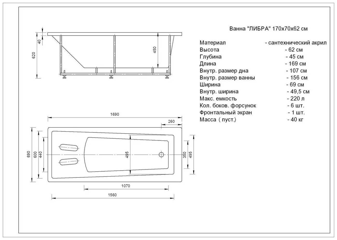 Характеристи АКВАТЕК Ванна Aquatek Либра 170x70 LIB170-0000021 акрил
