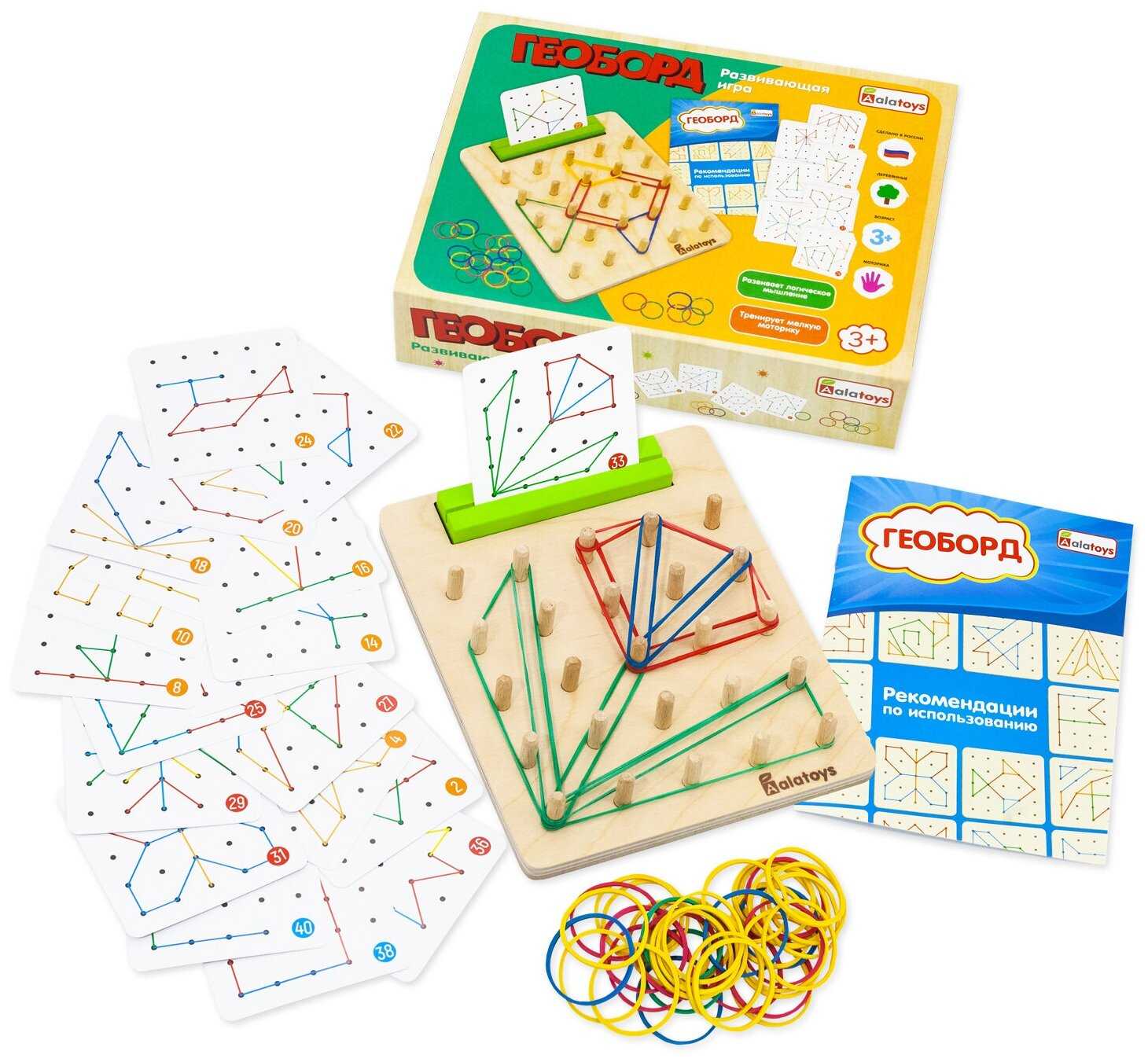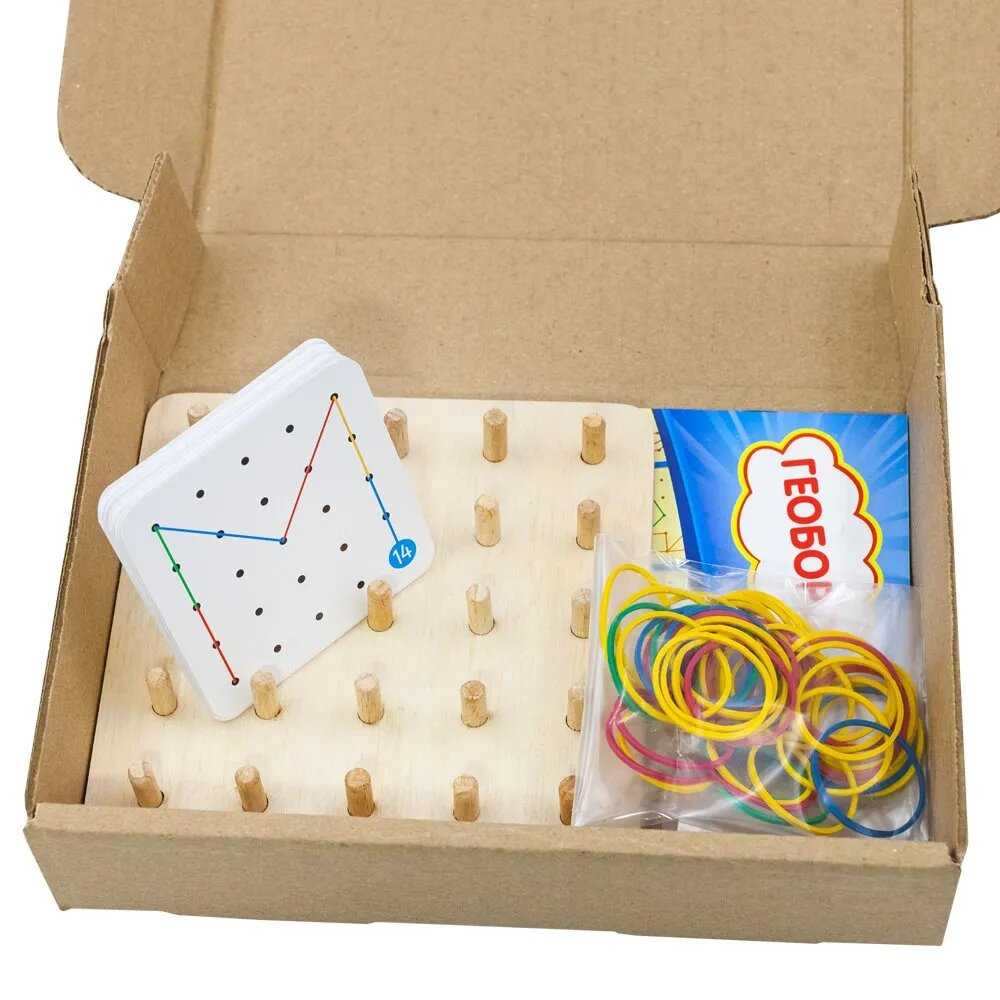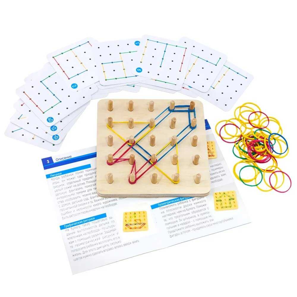 Комплектация : | Коробка, доска со штырьками, разноцветные резинки-50 шт., набор карточек - 20 штук, буклет, подставка под карточки |