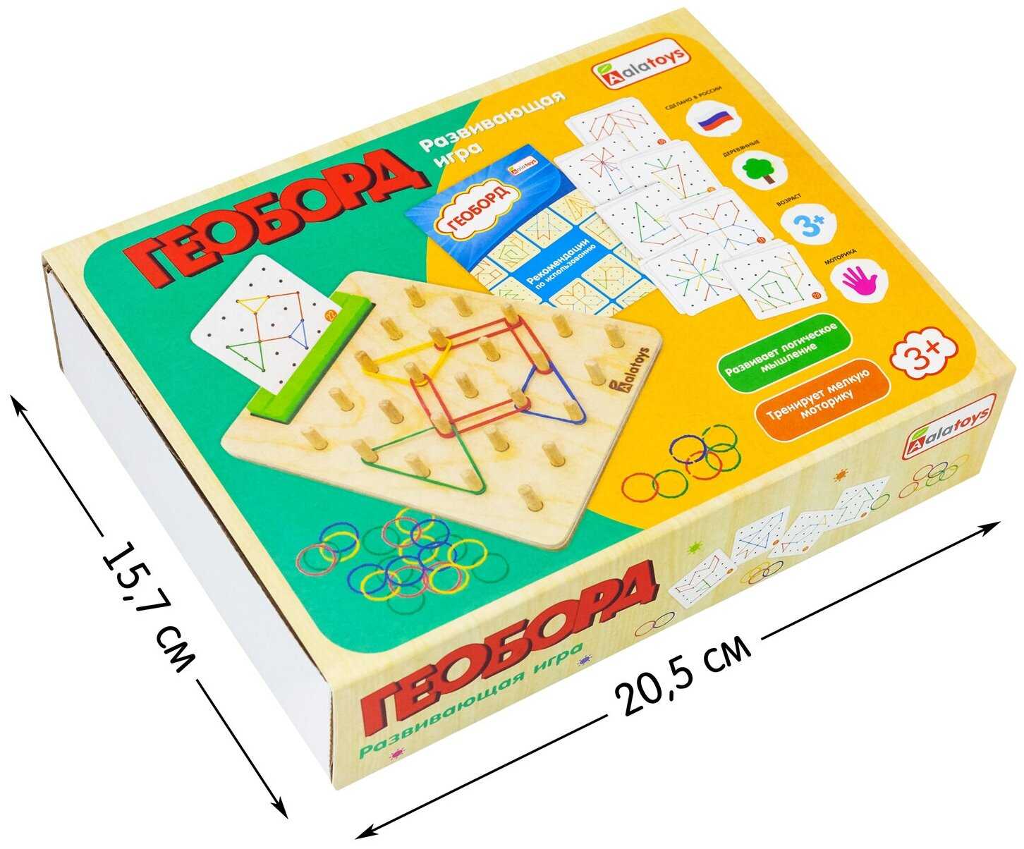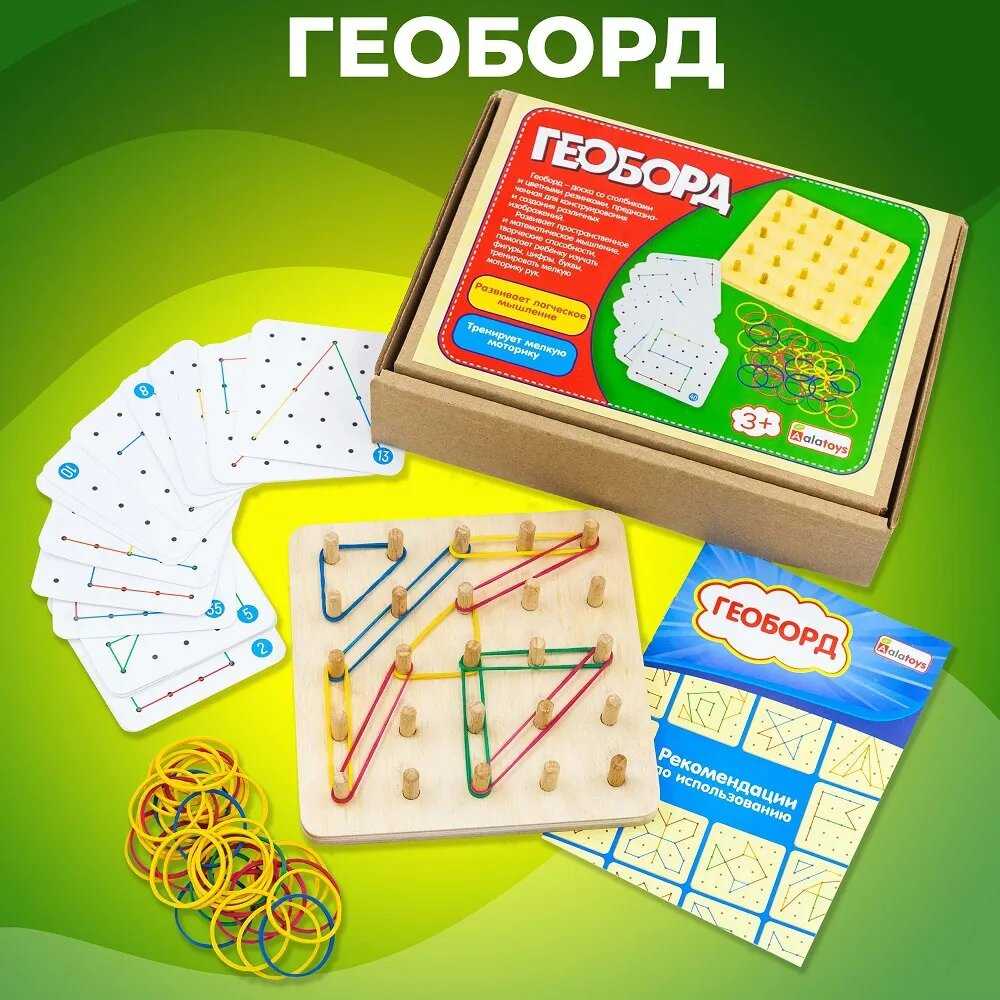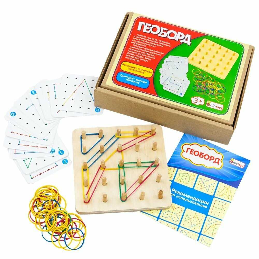 Комплектация : | Коробка, доска со штырьками, разноцветные резинки-50 шт., набор карточек - 20 штук, буклет, подставка под карточки |