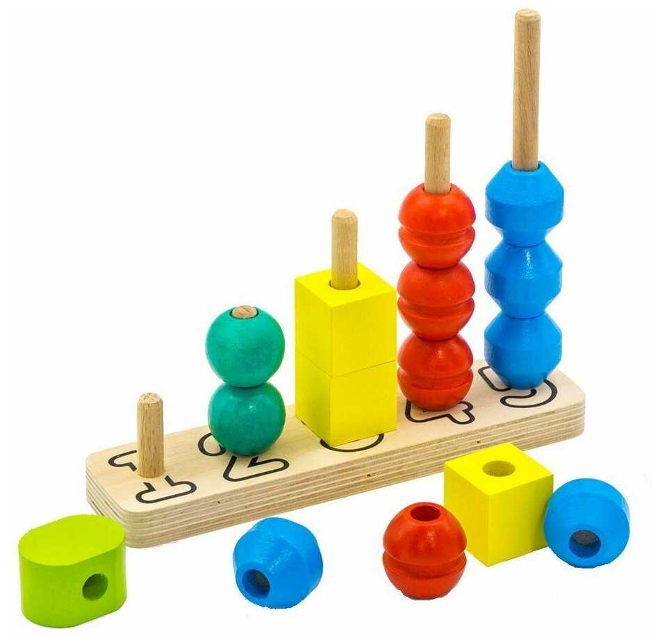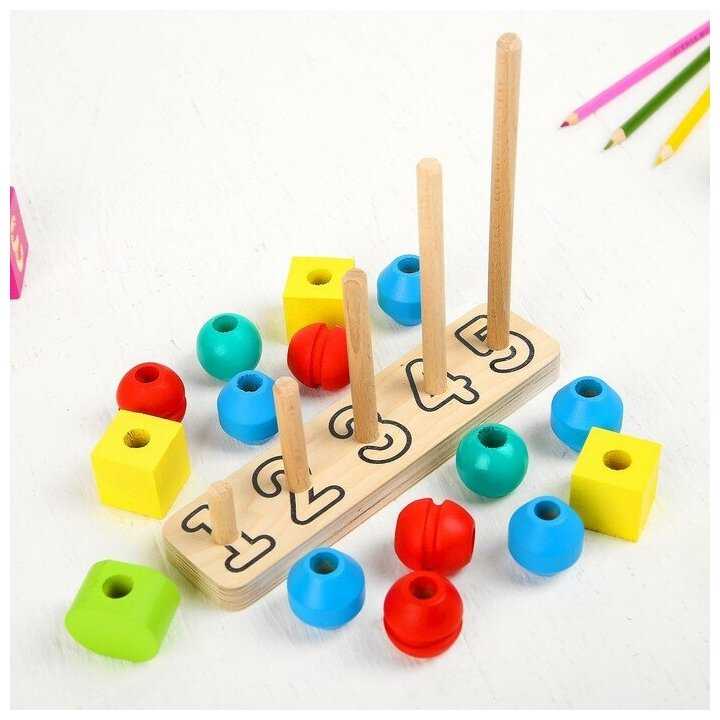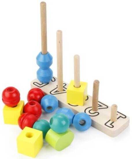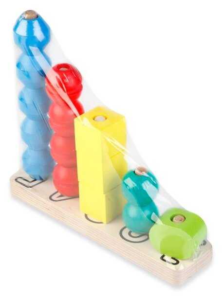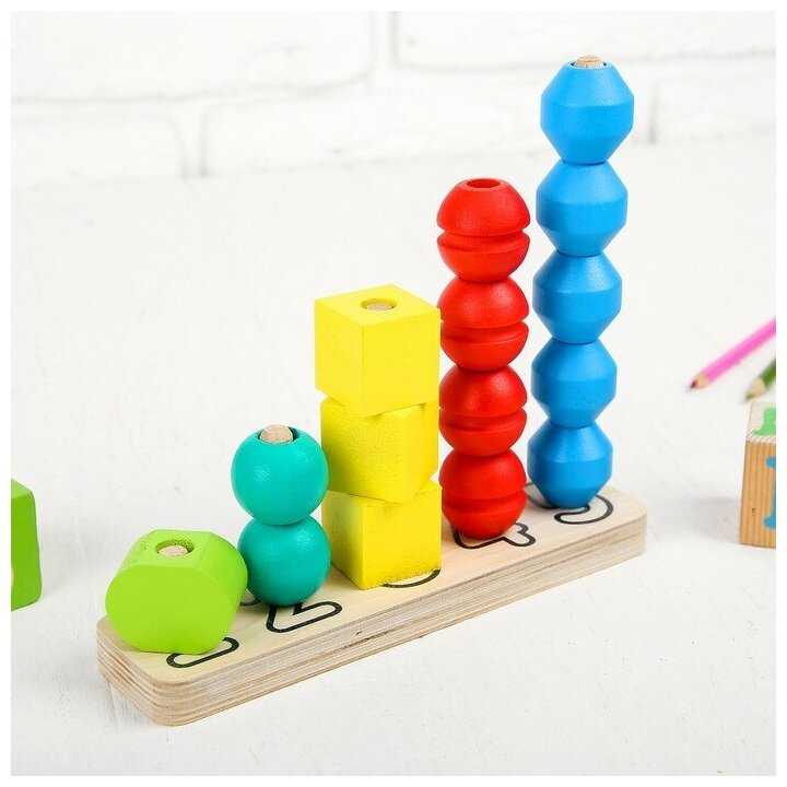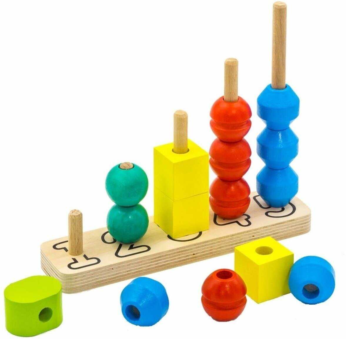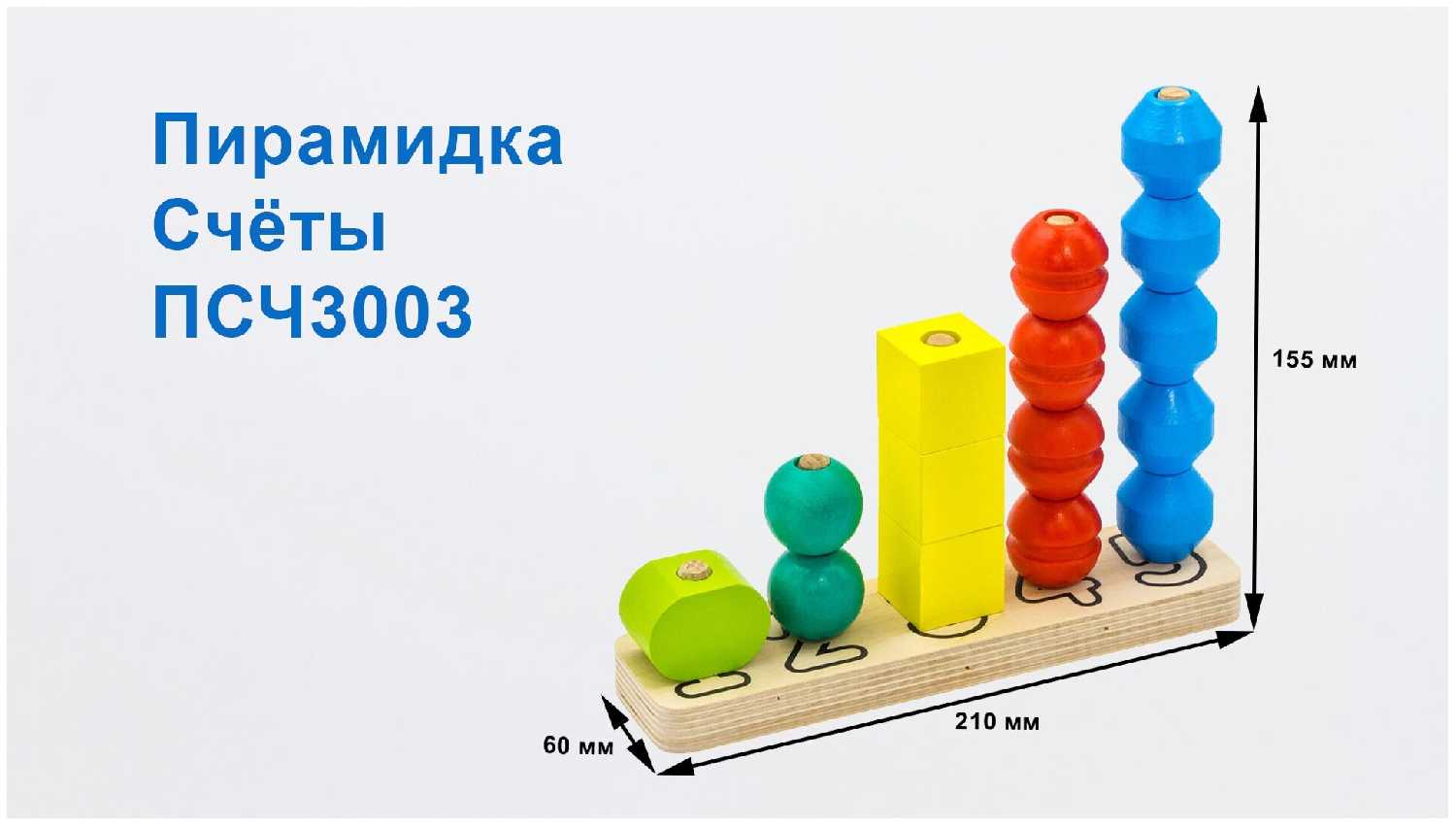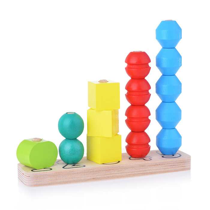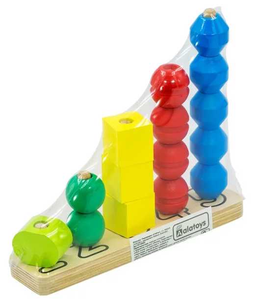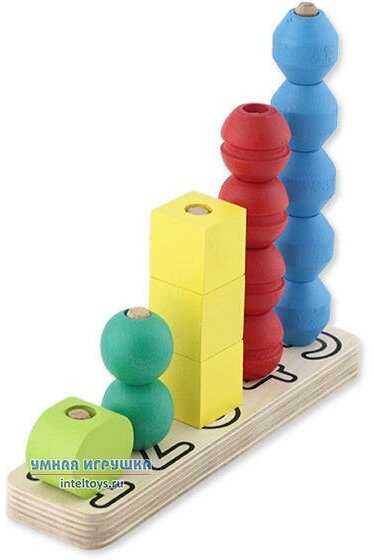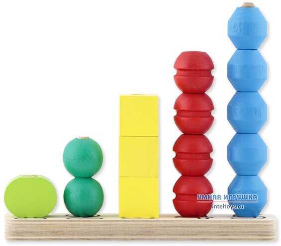 - + Отличный тренажёр в счёте до 5. Купили в садик 3х леткам. Самостоятельно собирать пирамидки дети очень любят в этом возрасте. Задача взрослого - обратить внимание на цифры на основании и проговаривать количество надетых на пирамиду элементов. Со временем ребёнок не только повторяет, но и сам пересчитывает надеваемые на штырьки элементы.