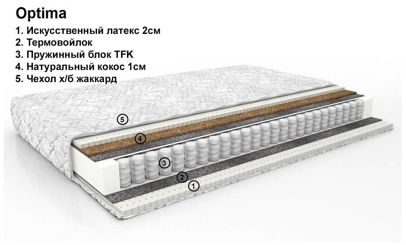 - наполнитель: комбинированный (высокоэласт. пена 2 см + кокос 1 см + блок независимых пружин TFK + высокоэласт. пена 2 см)