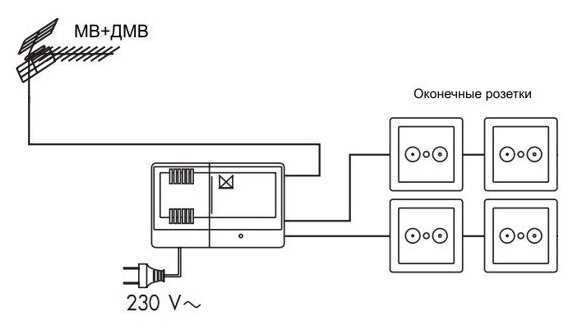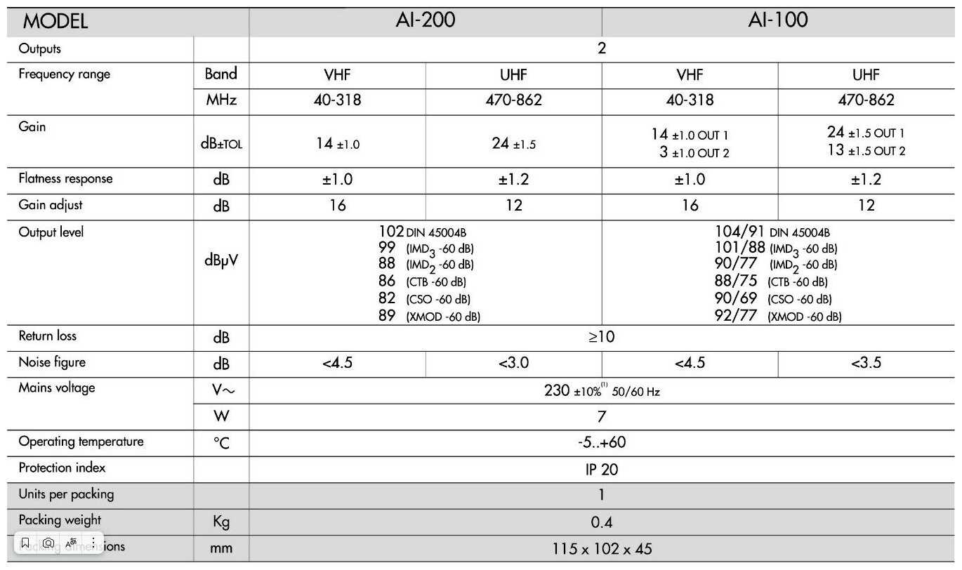 | Дополнительная информация : | количество входов антенны - 1, количество выходов - 2, диапазон принимаемых частот: VHF - 40-318 МГц UHF - 470-862 МГц, усиление: МВ/ДМВ - 18/24 дБ, максимальный выходной уровень: 102 дБмкВ (DIN 45004B), потребляемая мощность (230 В 50/60 Гц) - 7 Вт |