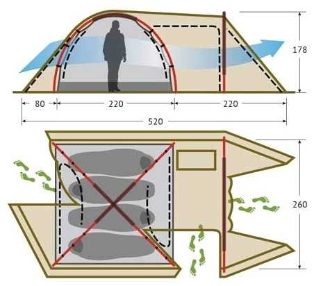 - + большая спальня, просторный вход, настил в тамбуре, двусторонние молнии на входах.