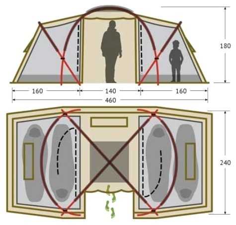 - + Много места, в каждой комнате могут расположиться по 2 взрослых, тамбур большой, при необходимости можно там еще двоих поселить. В тамбуре можно встать во весь рост (до 170см), ткань плотная, много кармашков внутри и снаружи для всяких мелочей, в каждой комнате можно подвесить фонарик. Хорошо вентилируется.