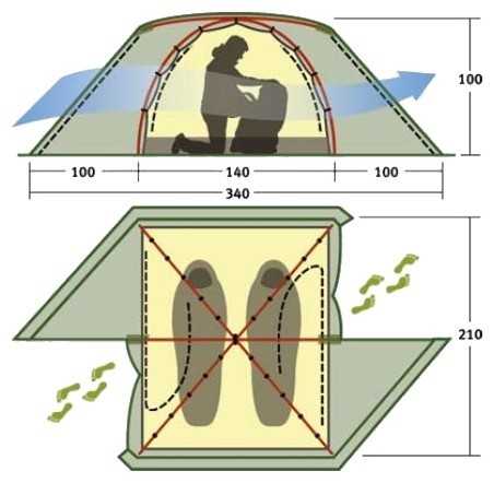 Наличие не большого предбанника (с двух сторон) для обуви, снаряжения и т.п. - особенно актуально в дождь.