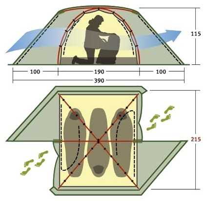 - + Двухслойная, можно ставить отдельно только внутренний тент в очень жаркую погоду. При установке внешнего тента надежно защищает от дождя.