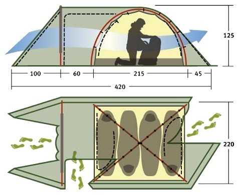 - + качественная, крепкие алюминиевые дуги, много входов и хорошая вентиляция.