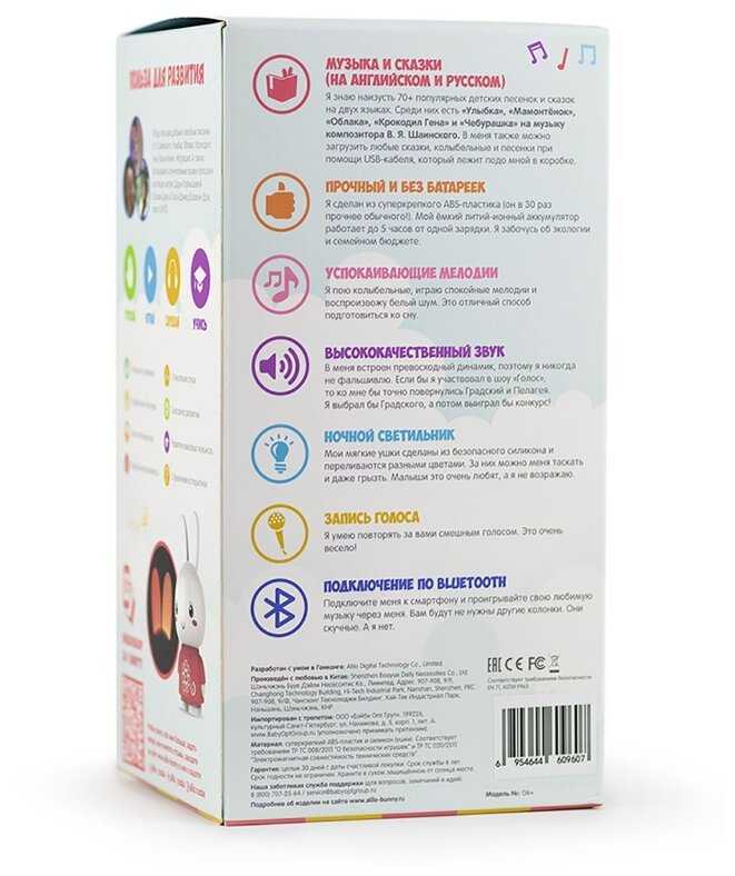 - + Звук, много интересных сказок, песен. Сам зайка лёгкий и заряжается через кабель