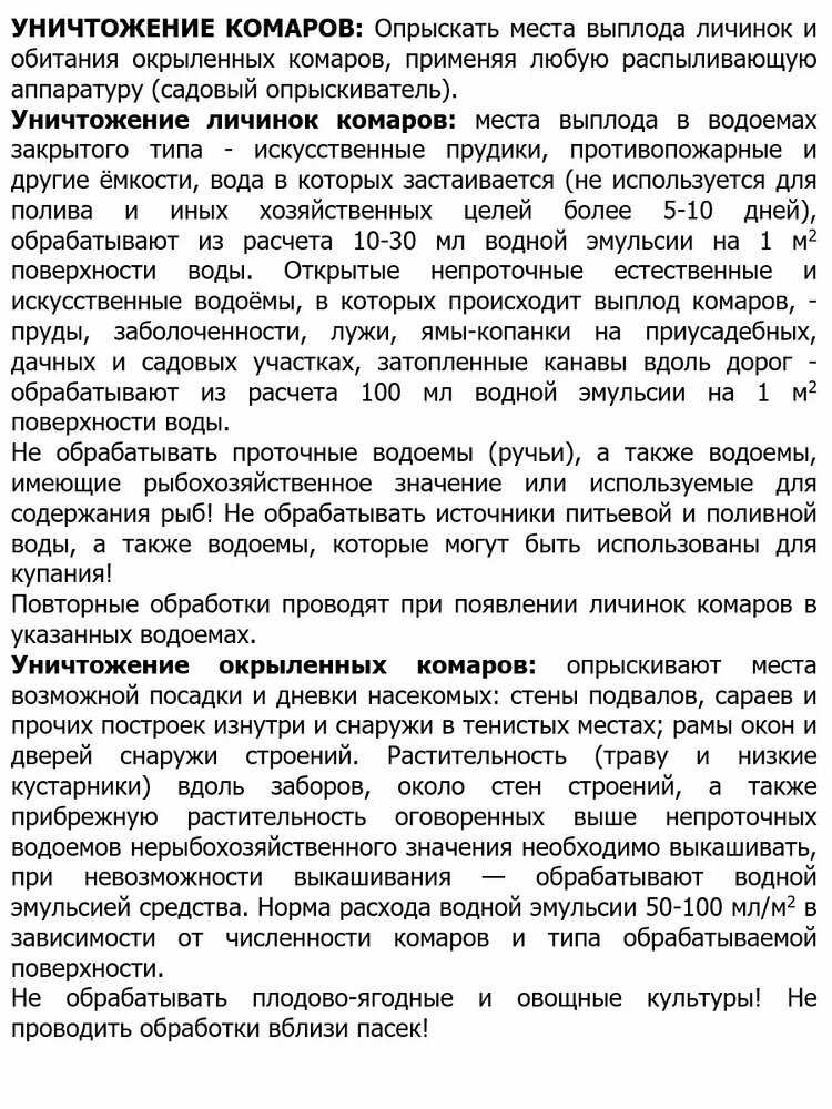 | Способ применения : | Средство необходимо развести с водой в пропорциях: муравьи мухи крысиные клещи кожееды чешуйницы: 5 мл на 1 литр, клопы тараканы пауки: 10 мл на 1 литр. С помощью любого опрыскивателя обработать места передвижения и обитания насекомых. Повторная обработка через неделю. Соблюдайте меры предосторожности. |