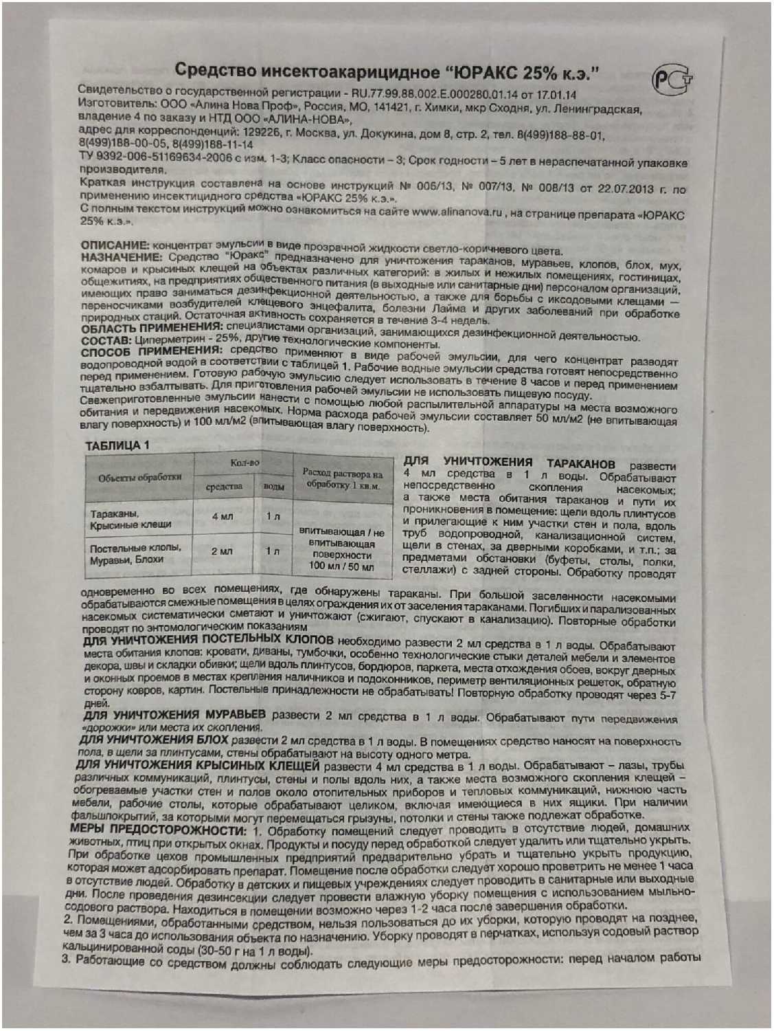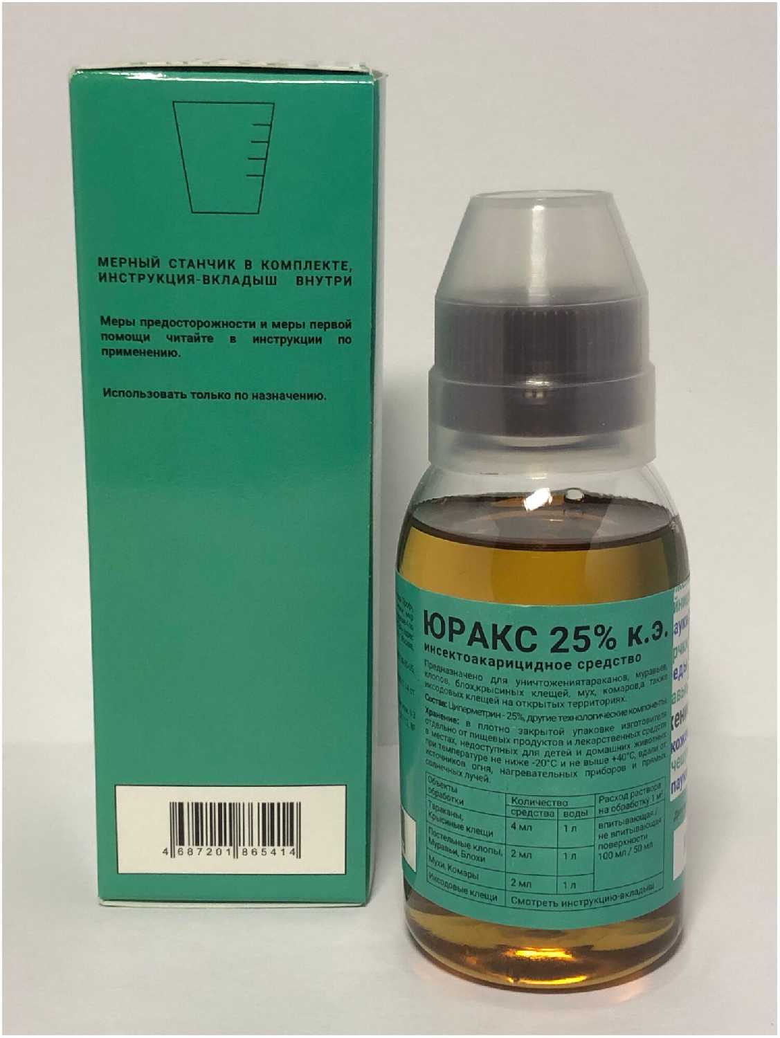 | Способ применения : | Юракс 500 мл - инсектоакарицидное средство в виде водорастворимого концентрата эмульсии. Применяется для уничтожения: иксодовых клещей комаров постельных клопов тараканов блох муравьев мух крысиных клещей. Средство необходимо развести с водой в пропорциях: иксодовые клещи: 125 мл на 1 литр, тараканы крысиные клещи: 4 мл на 1 литр, муравьи клопы блохи комары мухи: 2 мл на 1 литр. С помощью любого опрыскивателя обработать места передвижения и обитания насекомых. Повторная обработка через неделю. |