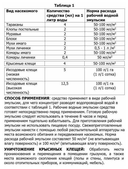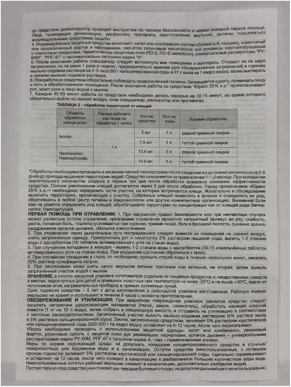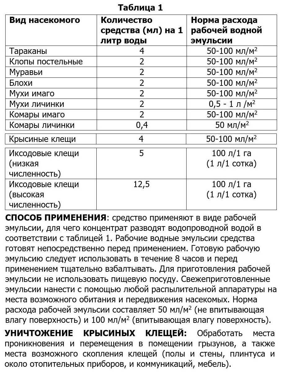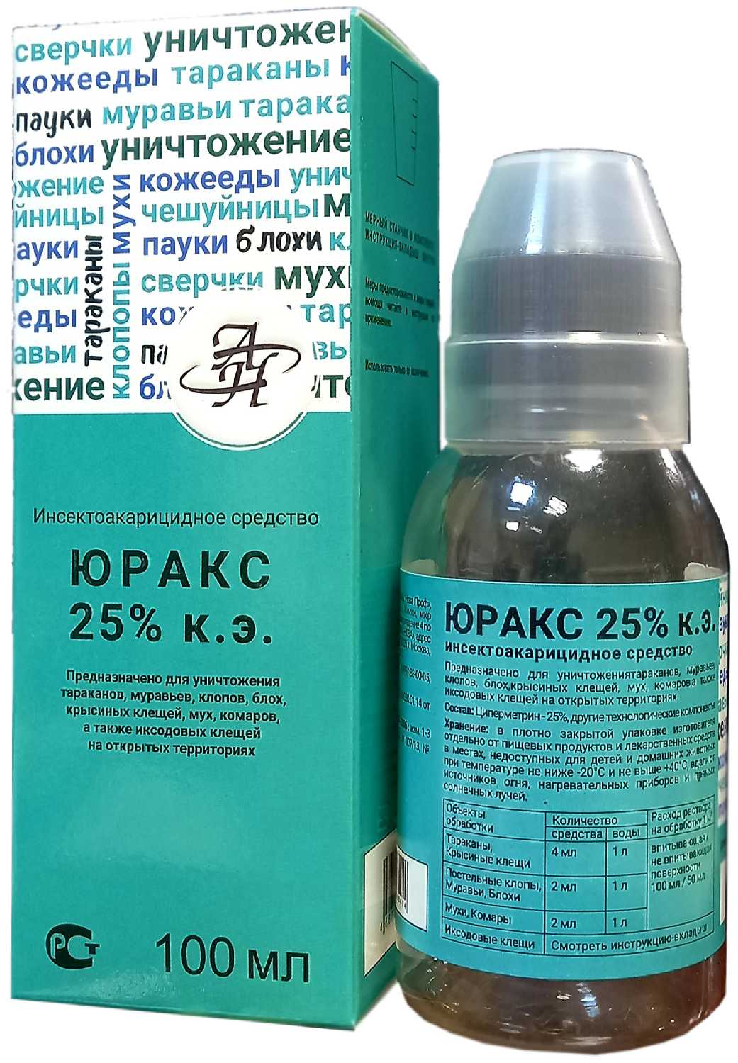 Способ применения : | Юракс 500 мл - инсектоакарицидное средство в виде водорастворимого концентрата эмульсии. Применяется для уничтожения: иксодовых клещей комаров постельных клопов тараканов блох муравьев мух крысиных клещей. Средство необходимо развести с водой в пропорциях: иксодовые клещи: 125 мл на 1 литр, тараканы крысиные клещи: 4 мл на 1 литр, муравьи клопы блохи комары мухи: 2 мл на 1 литр. С помощью любого опрыскивателя обработать места передвижения и обитания насекомых. Повторная обработка через неделю. |