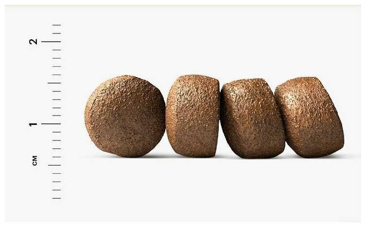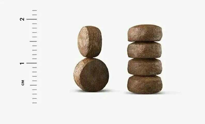 Гранулы корма имеют средний размер, примерно 10 мм в диаметре, что является оптимальным для большинства взрослых кошек. Их плотная, но не чрезмерно твердая текстура позволяет животным разгрызать их, что способствует механическому очищению зубов от налета. Однако для пожилых кошек или питомцев с проблемными зубами такие гранулы могут оказаться великоватыми, что требует наблюдения за процессом приема пищи. -