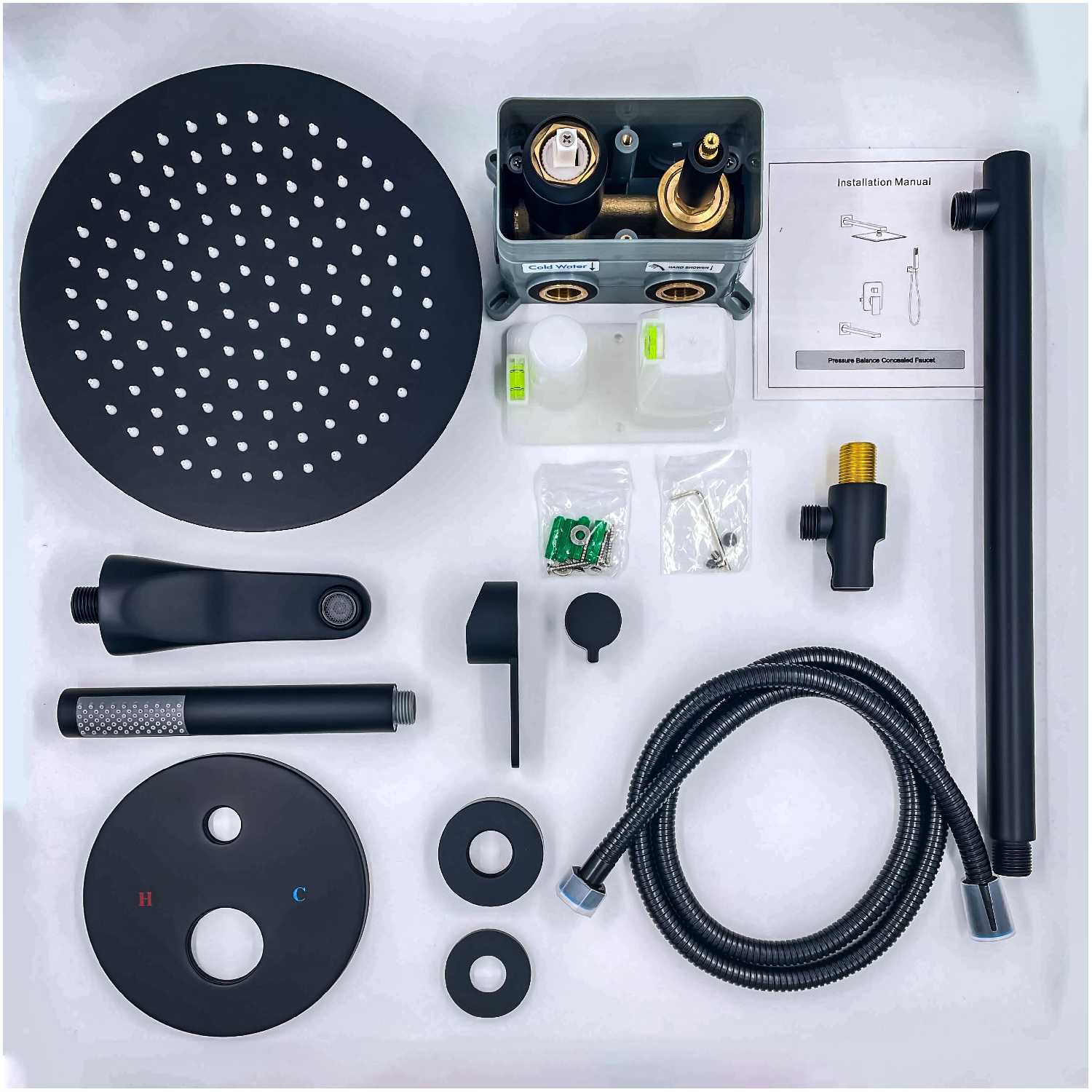 | @Комплектация : | Верхний душ размер 250*250мм нержавеющая сталь Держатель для лейки латунь Душевая лейка (ручная лейка) нержавеющая сталь Излив латунь длина 140 мм Кронштейн для верхнего душа нержавеющая сталь Скрытая монтажная часть Смеситель латунь глубина его погружения в стену от 55 до 75 мм, Шланг для душа длина 150см металлическая оплетка. |