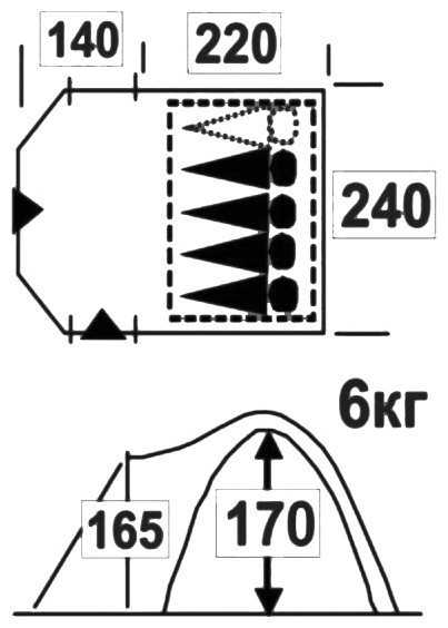 | Дополнительная информация : | длина внутренней палатки: 220 см, ширина внутренней палатки: 240 см |