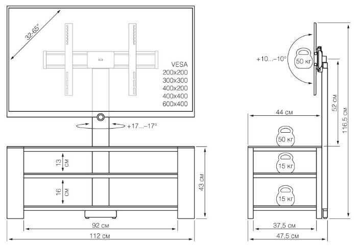 | Дополнительная информация : | угол наклона 10°, угол поворота 17°, встроенный кабель-канал, максимальная нагрузка на полку 15 кг |