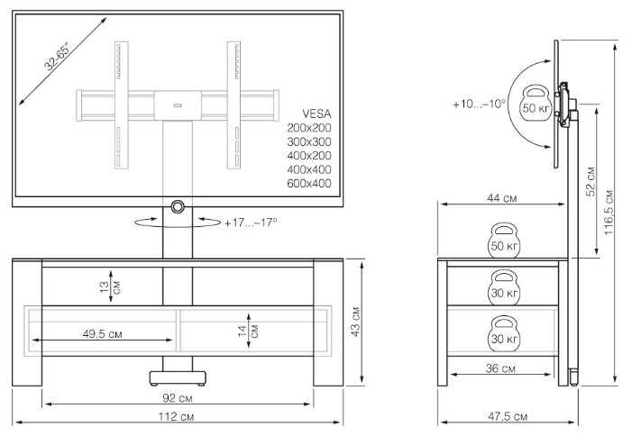 | Дополнительная информация : | угол наклона 10°, угол поворота 17°, встроенный кабель-канал, максимальная нагрузка на полку и на дно ящика 30 кг |