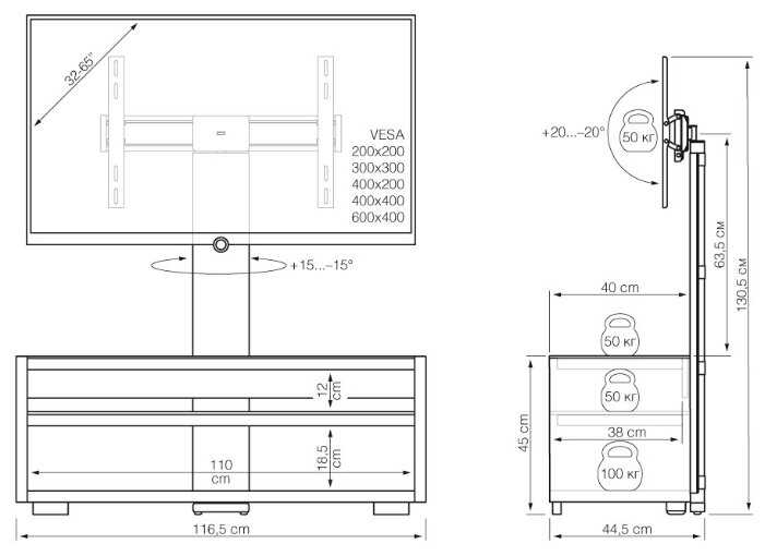 | Стандарт Vesa : | 200x200 мм, 300x300 мм, 400x200 мм, 400x400 мм, 600x400 мм |